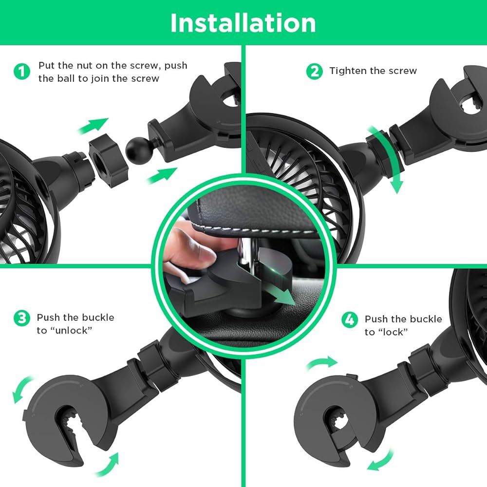 【مروحة سيارة مطورة بخطاف متين】تأتي مروحة السيارة المحمولة هذه بخطاف متين. يمكن تثبيت مسند رأس السيارة القوي هذا بإبزيم لتأمين قبضة المروحة المحكمة على مقعدك الخلفي. يمكنك تثبيته يدويًا دون أي أدوات إضافية بسهولة. يرجى قراءة دليل المستخدم للتثبيت قبل الاستخدام.