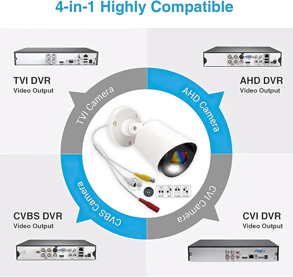 متعددة المتوافقة 4 في 1: تأتي كاميرا الأمان الخاصة بنا مع 4 خيارات مختلفة لإخراج الفيديو - 5MP TVI، 5MP CVI، 5MP AHD، و960H CVBS - مما يجعلها متوافقة بنسبة 100% مع مسجل Hikvision 5MP، ومسجل Dahua 5MP، وNight Owl 5MP DVR، وSwann DVR بدقة 5 ميجابكسل، والمزيد.