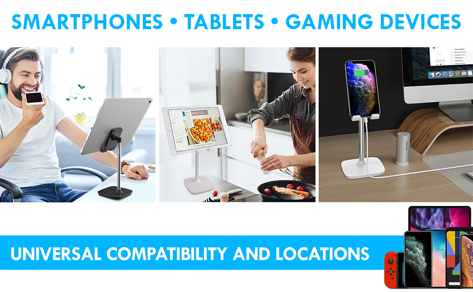 • يتمتع حامل الهاتف المحمول هذا بتوافق واسع وهو مناسب لجميع الهواتف الذكية والأجهزة اللوحية. وهو متوافق مع أي هاتف ذكي من Apple أو Android وiPad أو جهاز لوحي بحجم يتراوح بين 4 إلى 10 بوصات