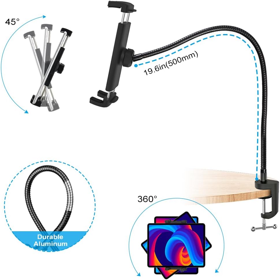【سهولة التدوير والتعديل】يحتوي حامل iPad للهاتف المحمول هذا على طول رقبة معقوفة قابلة للتعديل يبلغ 19.6 بوصة (50 سم). يحتوي حامل مشبك الهاتف/الكمبيوتر اللوحي على وصلة كروية 360 درجة تسمح لك بالتعديل بسهولة على الزاوية والموضع المرغوب فيه للحصول على أفضل زاوية رؤية.