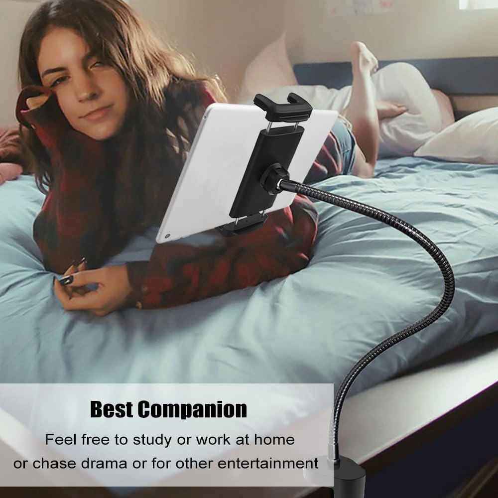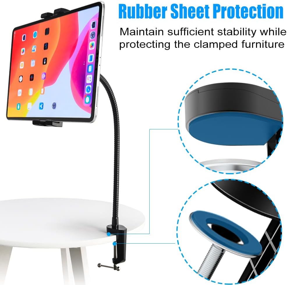 يتميز حامل iPad للهاتف السرير هذا بطول رقبة معقوفة قابلة للتعديل يبلغ 19.6 بوصة (50 سم). إن تركيبات سبائك الألومنيوم المتينة مناسبة للطاولة بسمك أقصى يبلغ 2.36 بوصة.