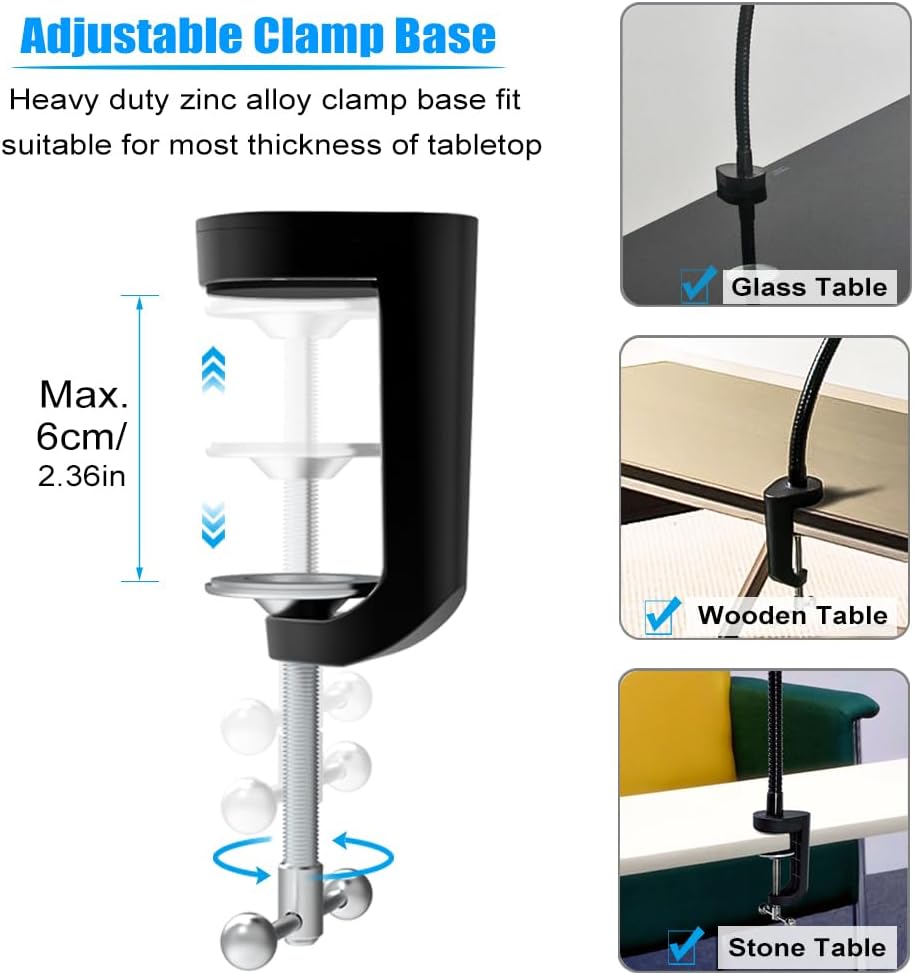【سهلة التركيب والوضعية】تركيبات سبائك الألومنيوم المتينة مناسبة للطاولة بسمك أقصى يبلغ 2.36 بوصة. سهل التثبيت دون الحاجة إلى أدوات، ويمكنك الاستمتاع بحرية الفيديو مستلقيًا على سريرك أو أريكتك، ومقابلة العائلة على Desktop Clips، وقراءة الوصفات في المطبخ، والمزيد. يسمح تصميم T-bolt بسهولة شد المشبك، وهو بسيط وسهل، ويأتي مع وسادة سيليكون مضادة للانزلاق/مضادة للخدش لن تخدش جهازك.