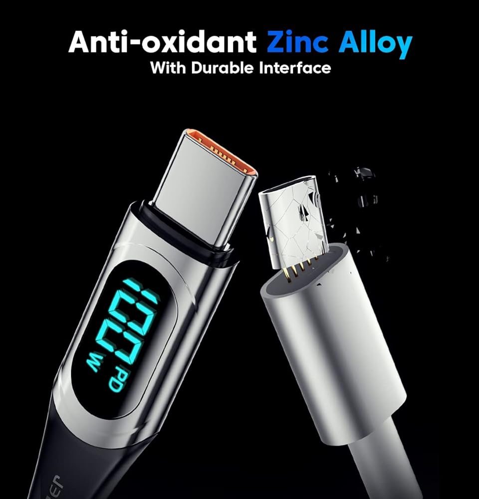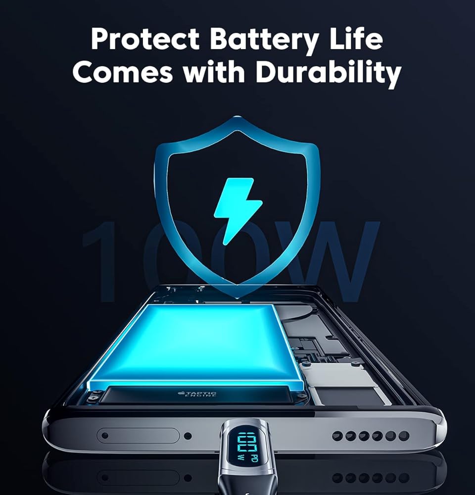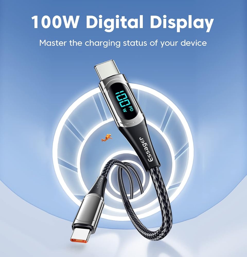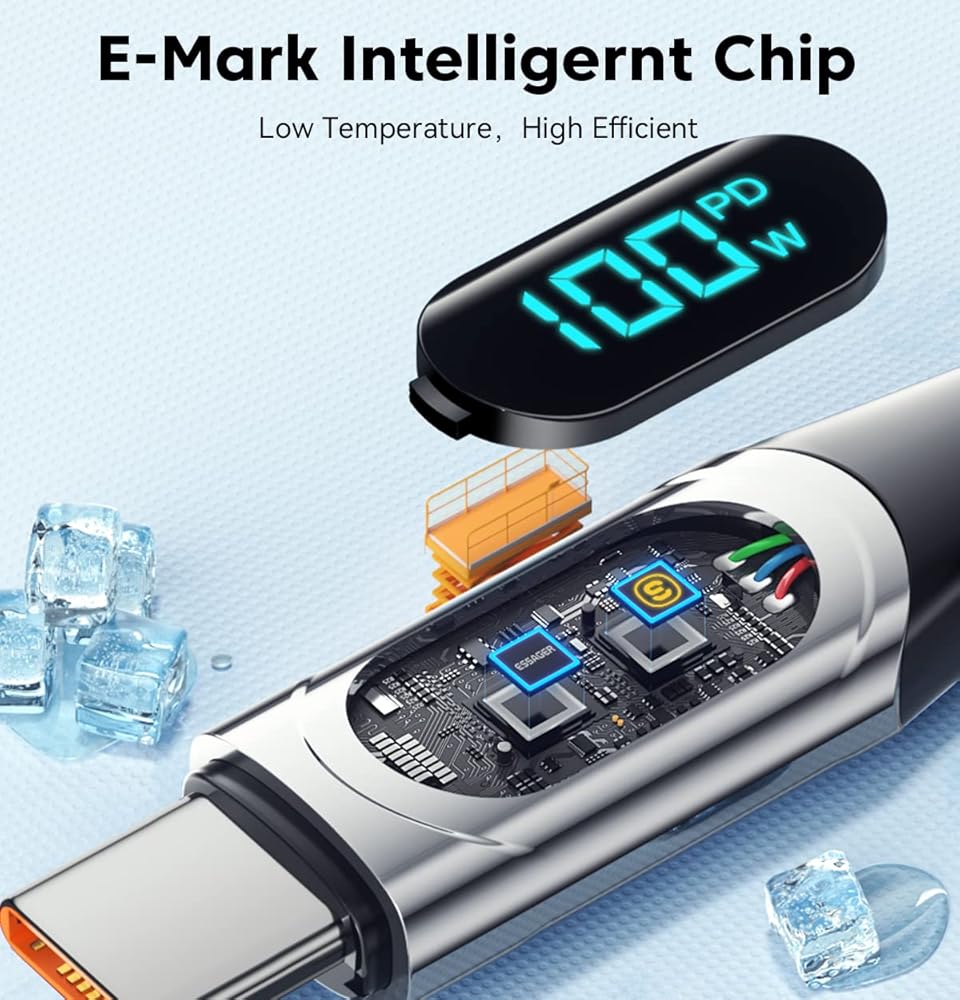 شاشة الطاقة الذكية: استمتع برؤية طاقة الشحن في الوقت الفعلي من خلال ميزة شاشة الطاقة الذكية الخاصة بنا. تتيح لك هذه الإضافة المبتكرة مراقبة حالة الشحن والإشارة إلى العمليات عالية الطاقة. مع الرقائق الذكية المدمجة، يقوم الكابل الخاص بنا تلقائيًا بضبط التيار والجهد لمنع تلف البطارية بسبب التيارات غير المستقرة. يرجى ملاحظة أن وحدة العرض تعرض قوة الشحن فقط ولا تزيد أو تنقص من تيار الشحن.