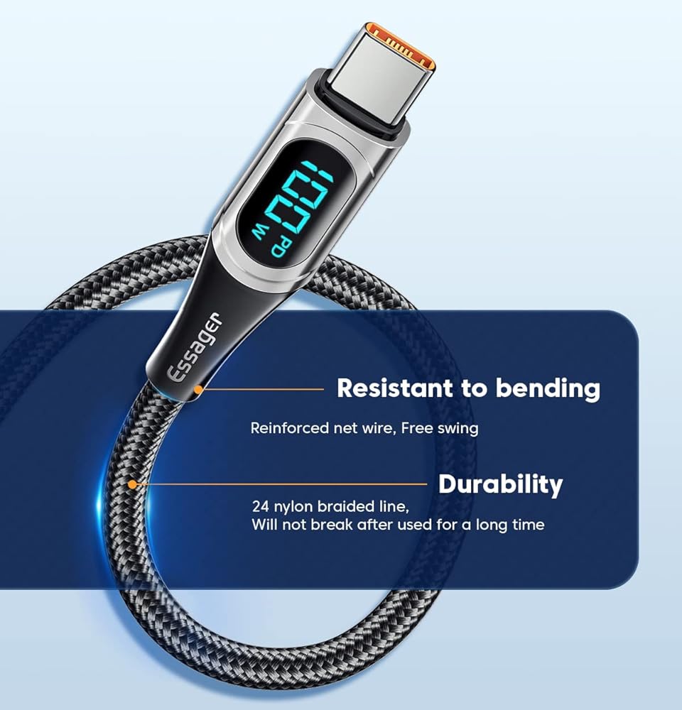 المتانة القصوى: يخضع الكابل الخاص بنا لاختبارات صارمة، مع أكثر من 36000 انحناء لضمان المتانة القصوى. يتميز بتصميم خاص من سبائك الزنك وجزء خارجي متين من النايلون المضفر، مما يجعله مرنًا بشكل استثنائي. مع كابل الشحن ESSAGER، يمكنك الاعتماد على حل شحن أقوى وأطول أمدًا.