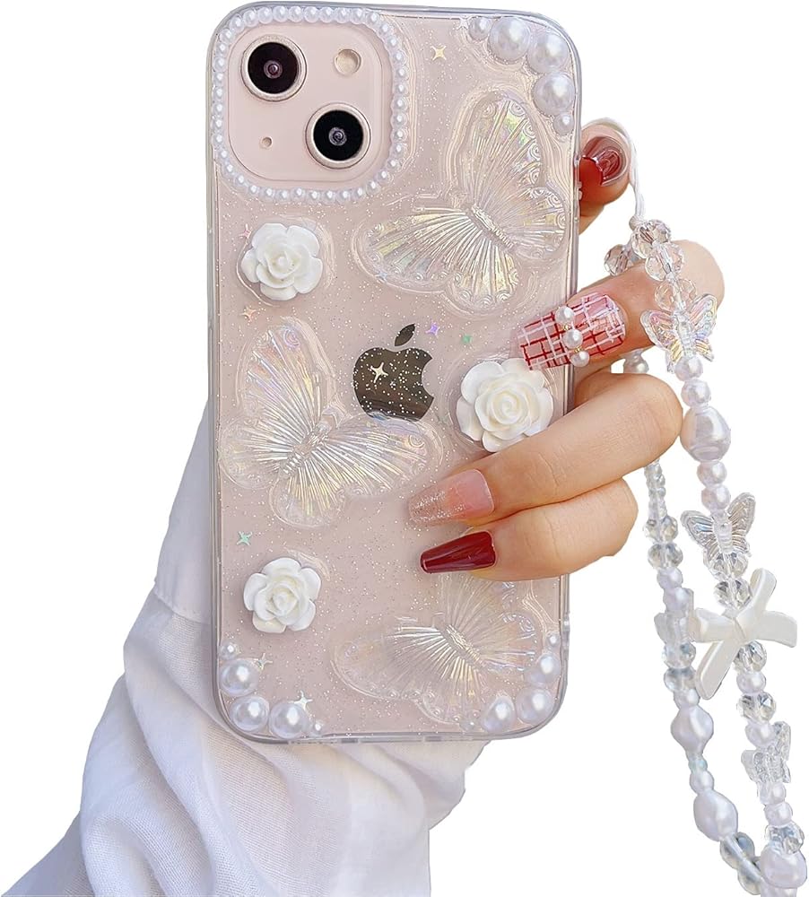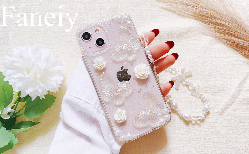 Faneiy لهاتف iPhone 13/14 حافظة مع سلسلة ساحرة على شكل فراشة زهرة ثلاثية الأبعاد حافظة هاتف لطيفة، حافظة كريستالية لامعة شفافة مع سوار معصم لؤلؤي مقاوم للصدمات لهاتف iPhone 13/14 مقاس 6.1 بوصة