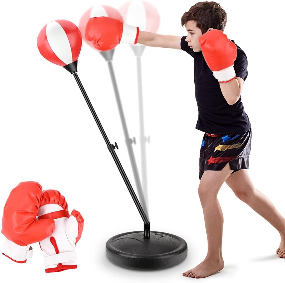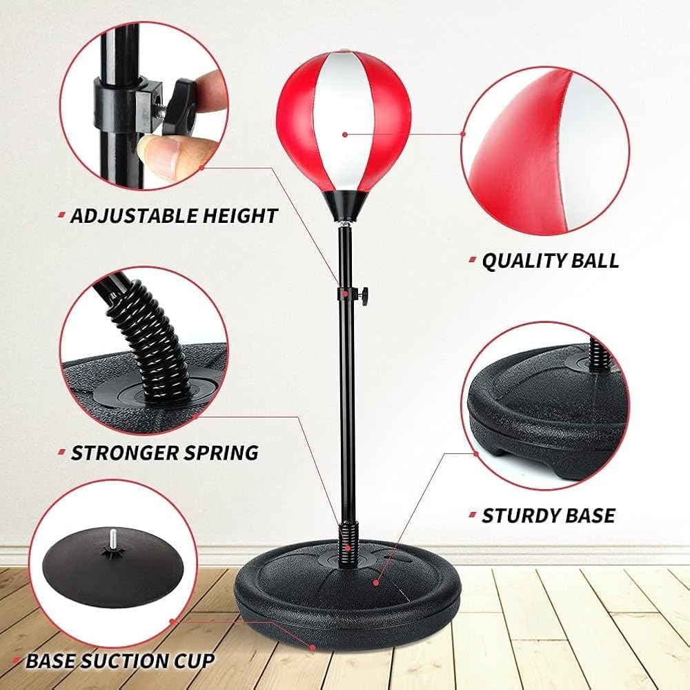جودة عالية - حامل أنبوبي من الستانلس ستيل، كرة ملاكمة قابلة للنفخ من جلد البولي يوريثين السميك، وقفازات مع عازل من القماش. يسمح الزنبرك القوي والمتين لحقيبة الملاكمة بالارتداد ذهابًا وإيابًا في اتجاهات 360 درجة ويمكنه تحمل كل قوة اللكم للأطفال.