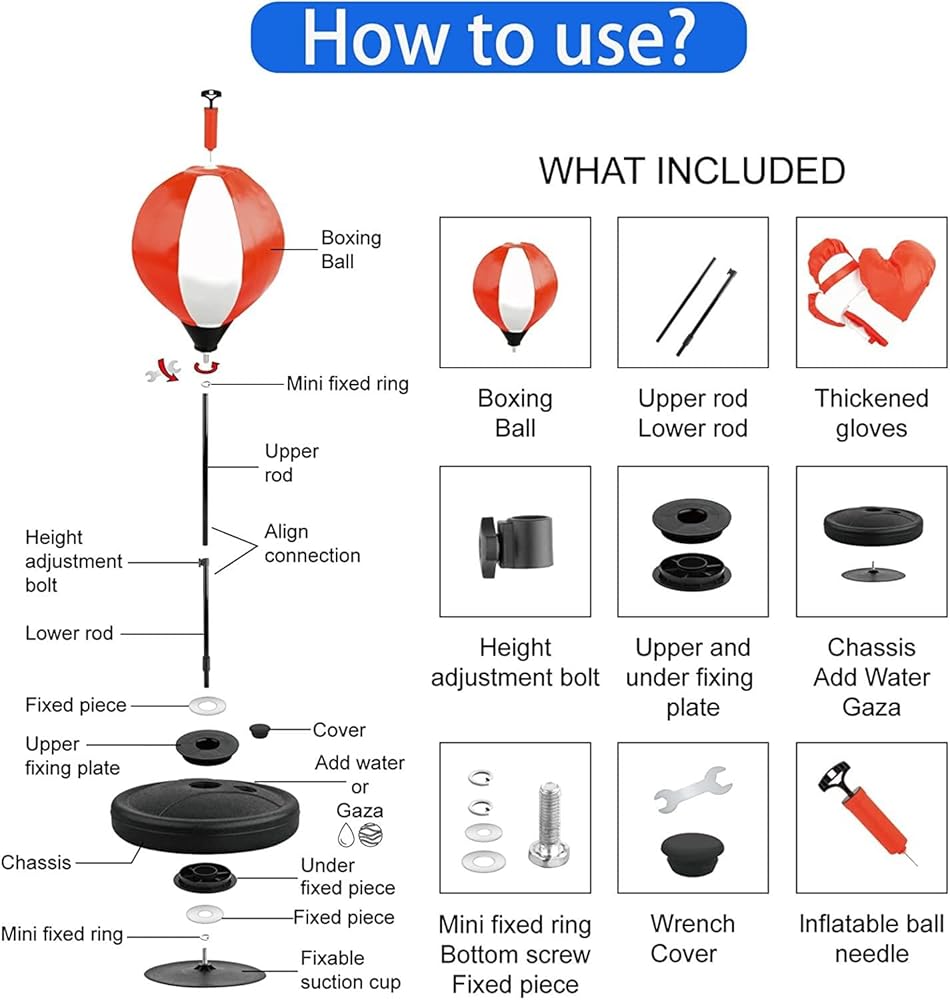 سهلة التجميع - تأتي مجموعة الملاكمة ييباي مع مخطط تعليمات بحيث يسهل إعدادها. استخدم مضخة الهواء لنفخ كرة اللكم (يرجى عدم نفخ الكثير من الهواء عند الاستخدام لأول مرة). يتميز بارتفاع قابل للتعديل من 27.5 انش إلى 43.3 انش، مناسب للأطفال من سن 5 إلى 10 سنوات. املأ القاعدة بالماء أو الرمل. الرمل هو الخيار الأفضل لملء المواد.