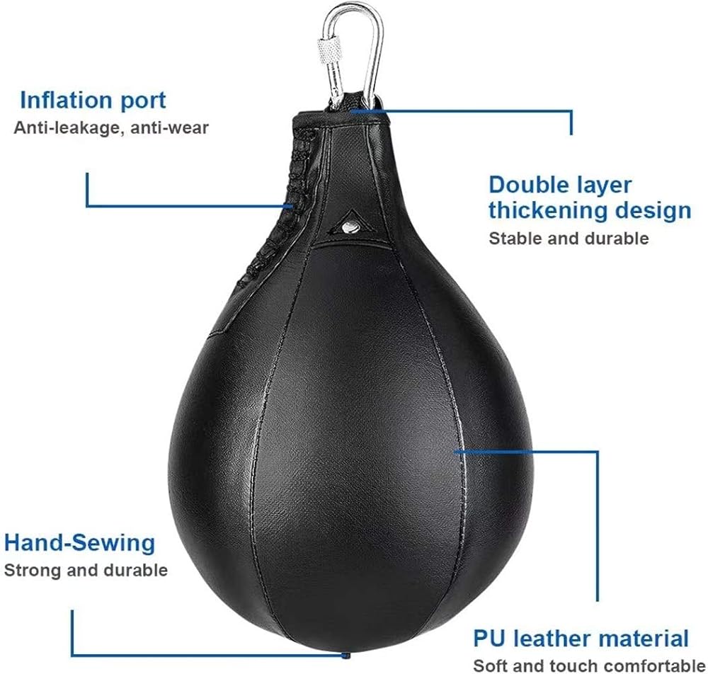 • 【حقيبة ملاكمة على شكل كمثرى】توفر حقيبة الملاكمة السريعة على شكل كمثرى استهدافًا سهلاً، مما يسمح لك بالحصول على اللكمات الدقيقة والارتدادات الجيدة دون إفساد إيقاعك. جيد للرياضيين لتطوير ردود الفعل والسرعة والتنسيق بين اليد والعين.