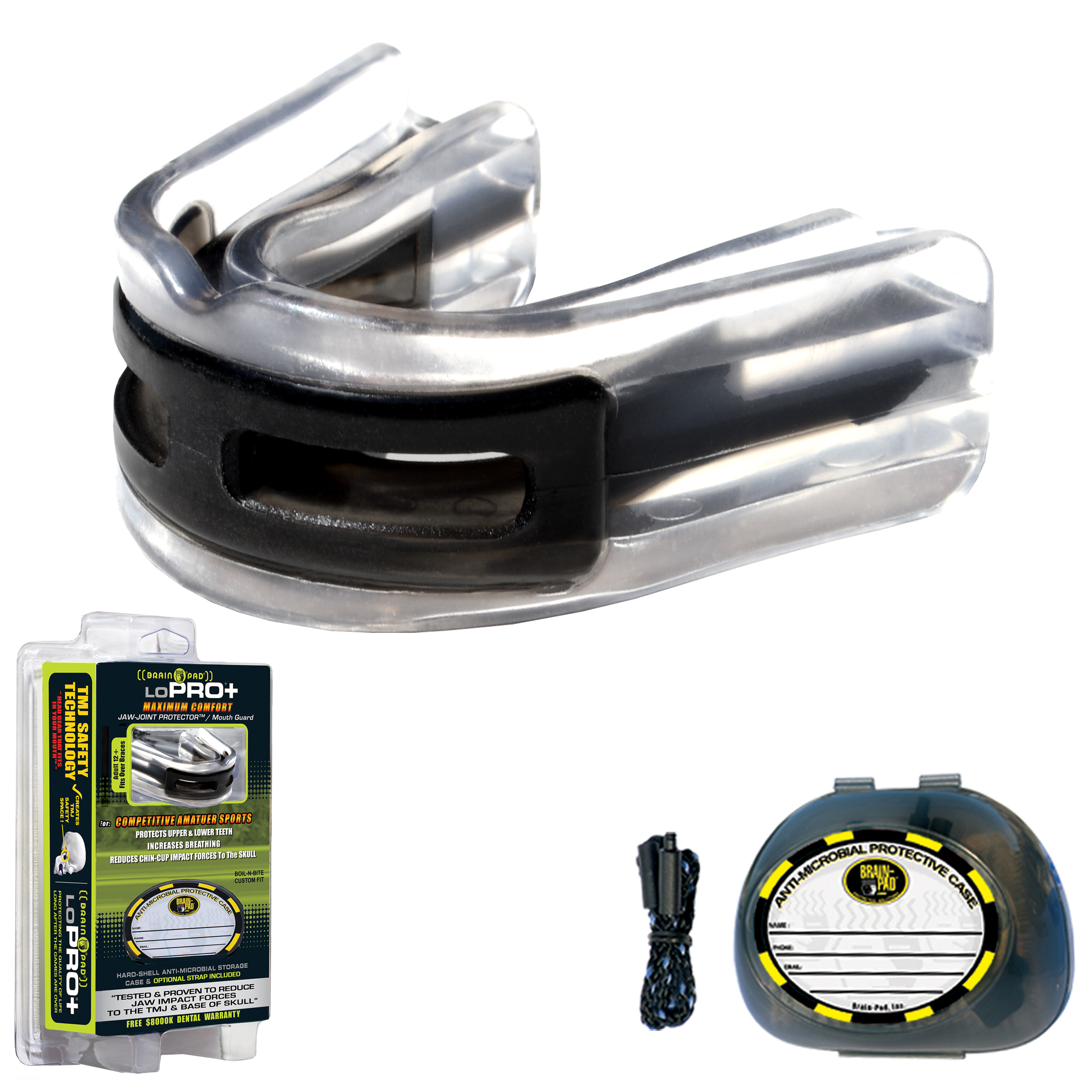 Brain Pad LoPro + حزام مصفح مزدوج/مجموعة بدون حمالات في واقي فم واحد للكبار (أزرق/شفاف)