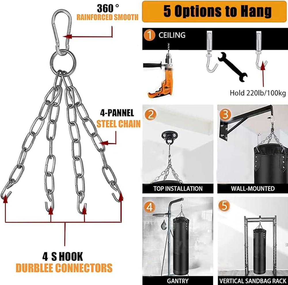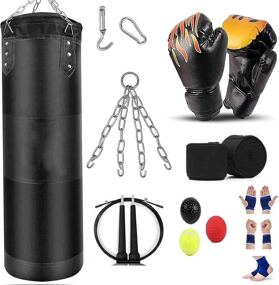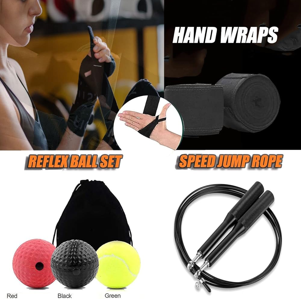 【مجموعة كاملة من ملحقات الملاكمة】تتضمن 1 × كيس ملاكمة بطول 4 أقدام، 1 × قفازات ملاكمة، 1 × مجموعة كرات عاكسة مكونة من 3 مستويات تدريب، 1 × حبل قفز، ضمادات لليدين، شماعة حقيبة، سلسلة فولاذية ذات 4 ألواح، كارابين، واقيات للمعصم. , واقيات الكف , واقيات الكاحل .