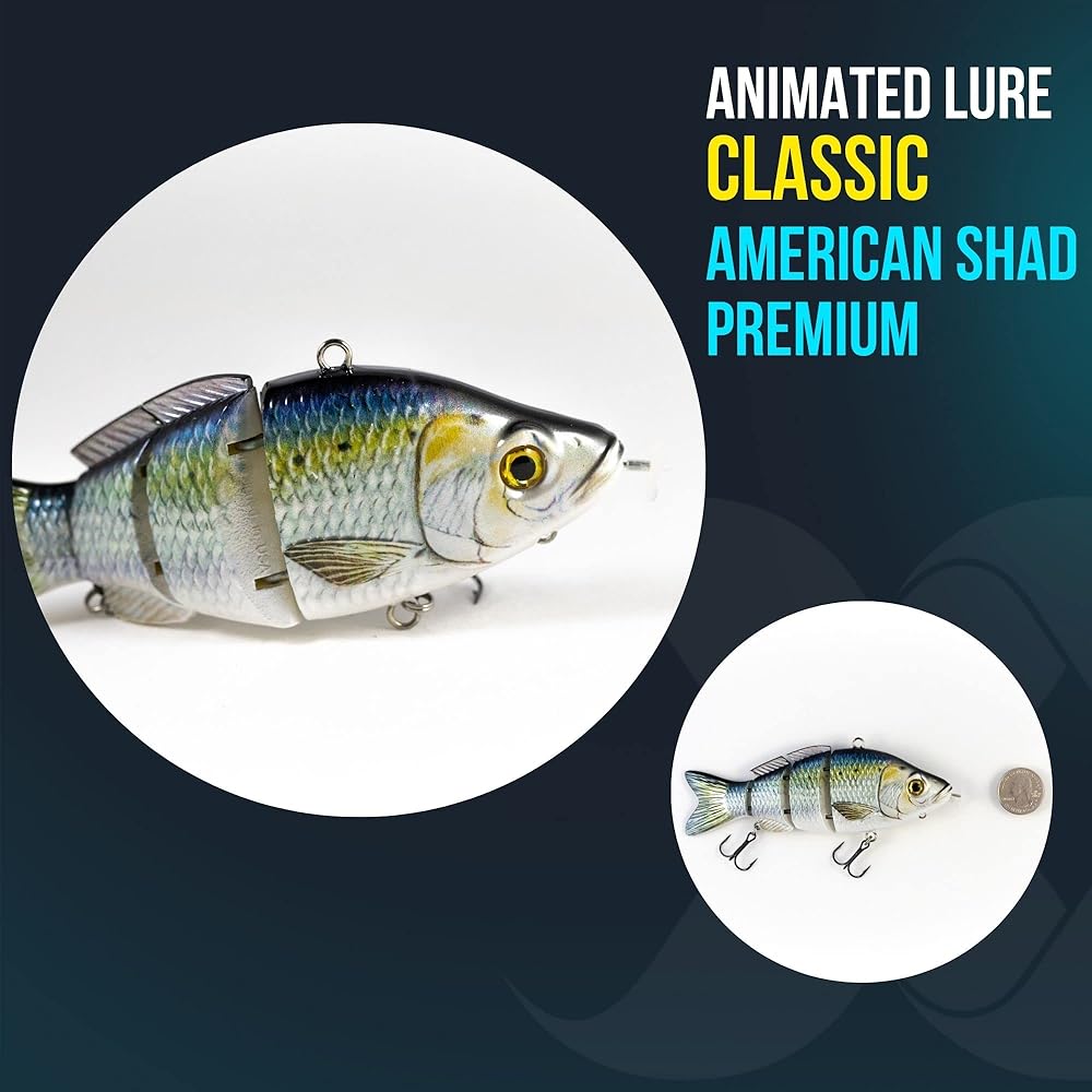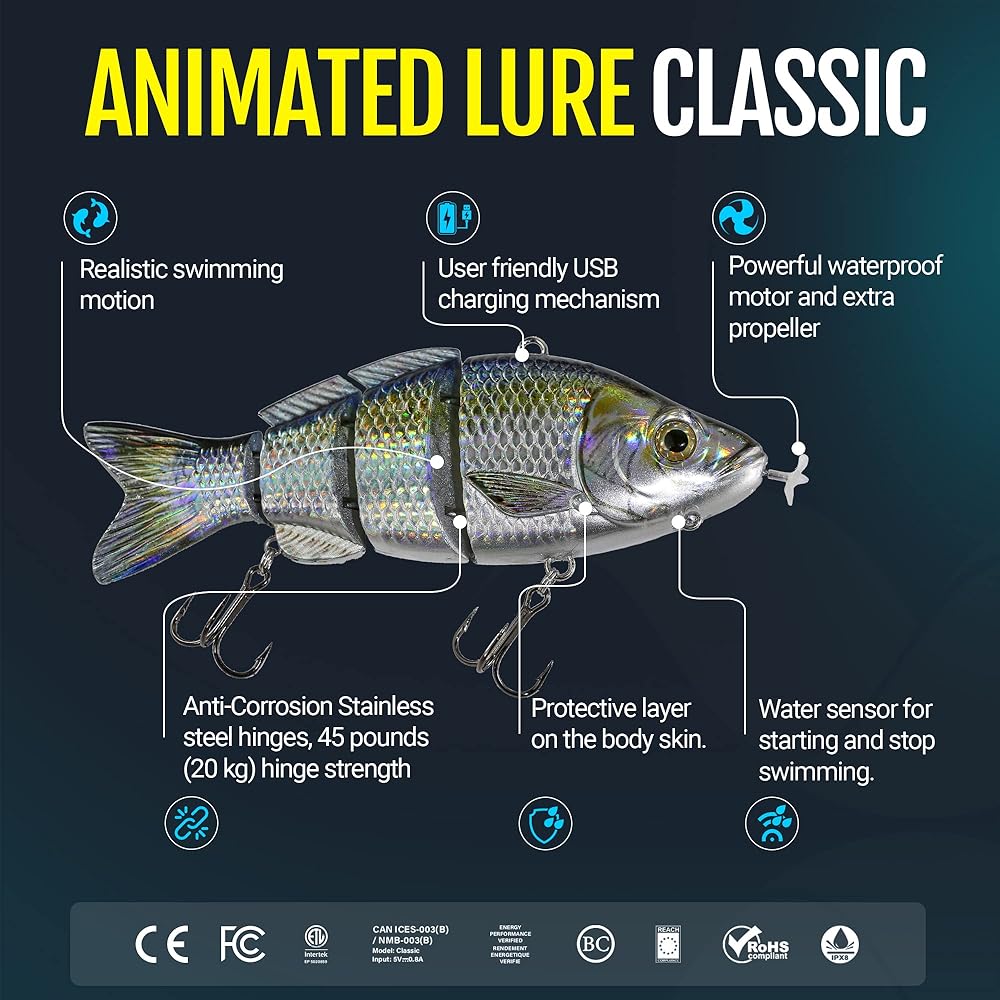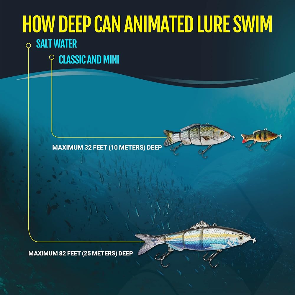 المواد والمتانة: الرسوم المتحركة الكلاسيكية مصنوعة من مادة أكريلونتريل بوتادين ستايرين والفولاذ المقاوم للصدأ المضاد للتآكل. تحتوي السمكة على جسم مكون من 4 أقسام مثبتة بمفصلات معدنية. تتمتع المفصلات بقوة قصوى تبلغ 45 رطلاً/20 كجم. لا ينبغي أن تسبح لعبة Animated Lure Classic بعمق يزيد عن 10 أمتار/32 قدمًا.