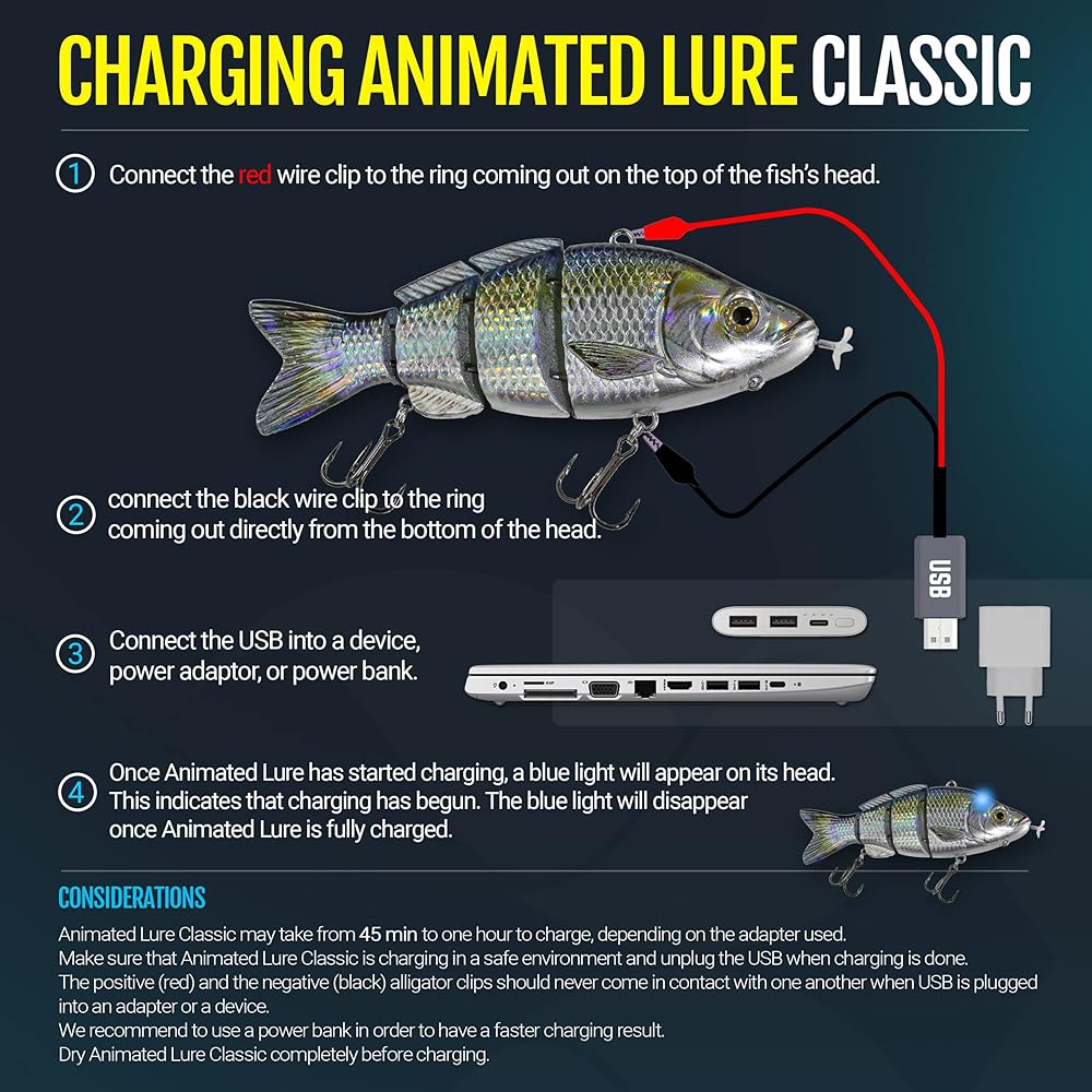 【الشحن ووقت البطارية】 تتمتع لعبة Animated Lure Classic بعمر بطارية يصل إلى 1.5 ساعة. يتم شحن السمكة بواسطة آلية شحن USB. سيتم تشغيل ضوء أزرق على الرأس للإشارة إلى أنه يتم الشحن وسيتوقف الضوء الأزرق بمجرد شحن Animated Lure بالكامل. قد يستغرق الشحن الكامل من 45 إلى 60 دقيقة حسب المحول المستخدم.