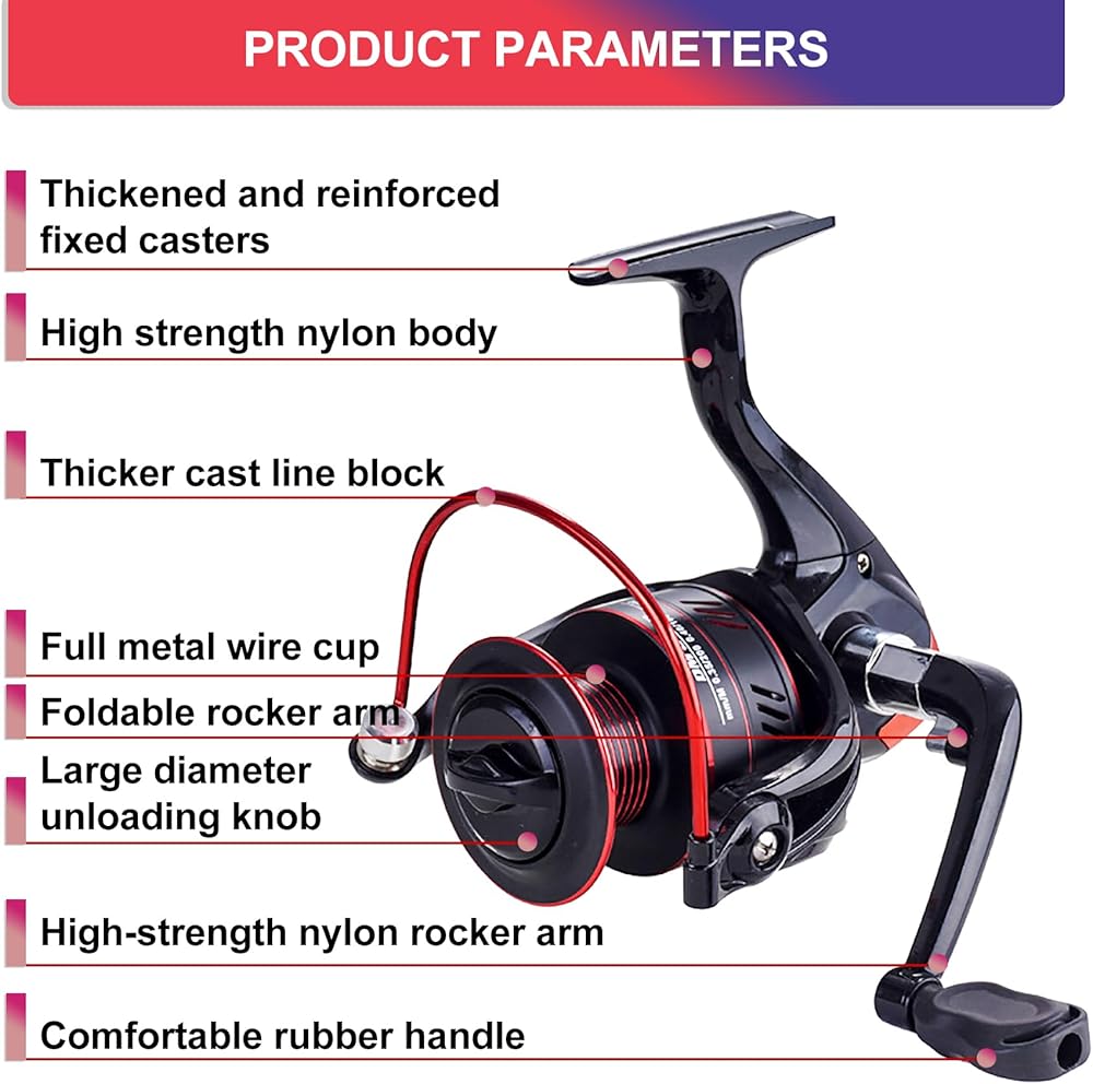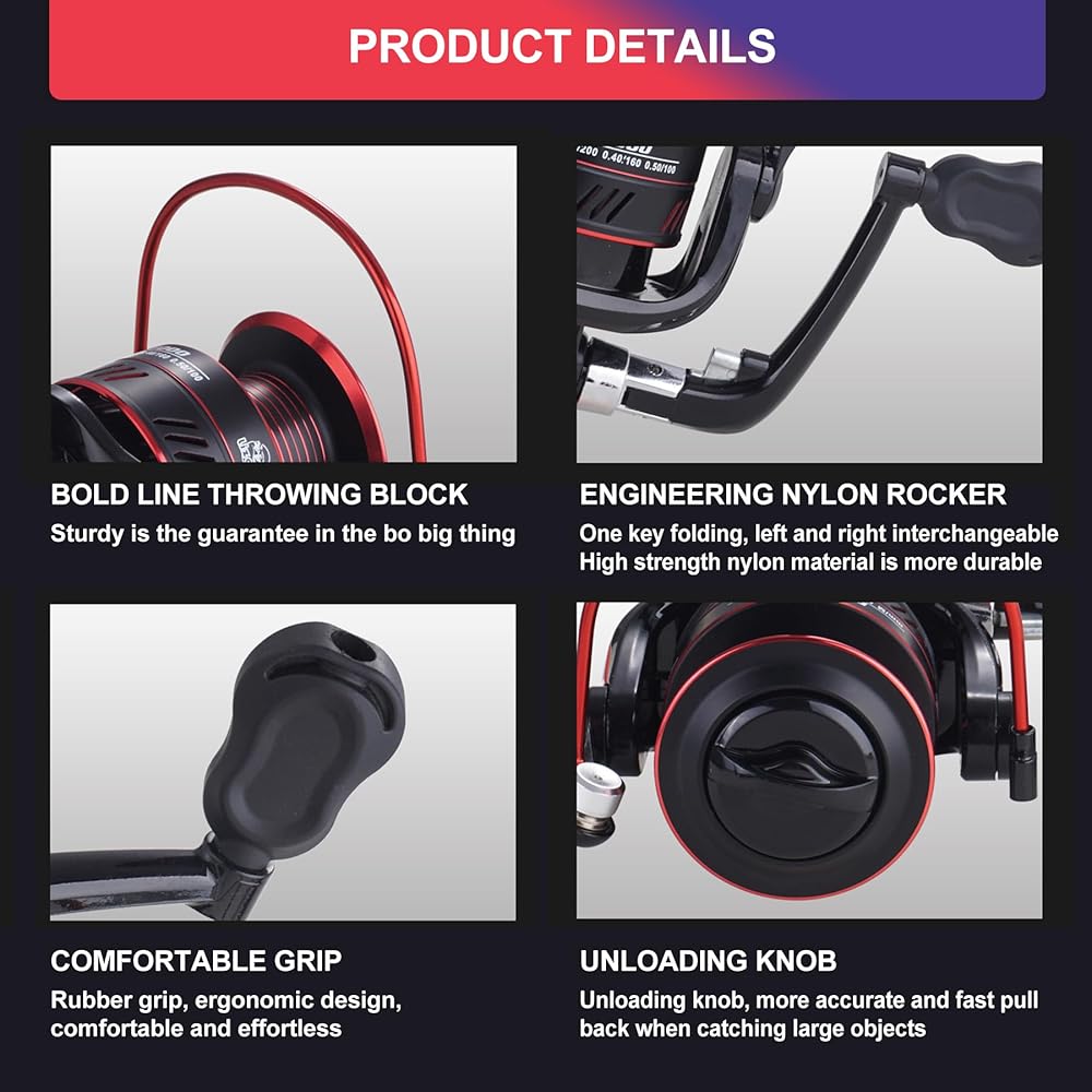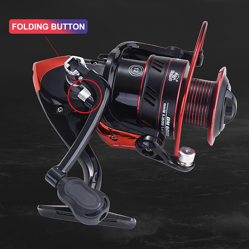 قابل للطي وموفر للجهد: يمكن طي الذراع الهزاز للاستخدام ويمكن تبديله بين اليد اليسرى واليمنى، يمكنك ضبطه وفقًا لعادات وتفضيلاتك المعتادة. بالإضافة إلى ذلك، تحتوي هذه البكرة الدوارة على مقبض تعديل للتفريغ، والذي يمكن سحبه للخلف بشكل أسرع وبجهد أقل عند اصطياد الأسماك الكبيرة.