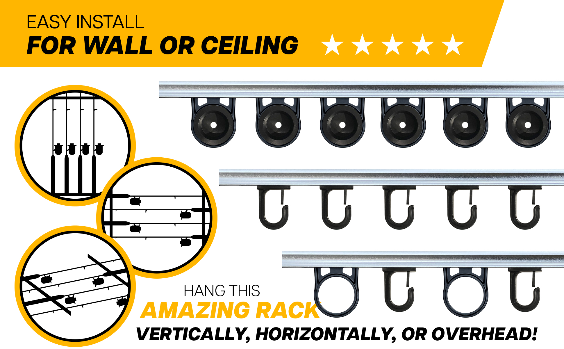 حامل تخزين قضبان الصيد: يحمل ما يصل إلى 6 مجموعات من القضبان والبكرات مع ميزة المسار المنزلق التي تسمح لك بإضافة المزيد من الرفوف لتوسيع سعة القضيب من 6 إلى 12 و18 و24 وما بعدها.
