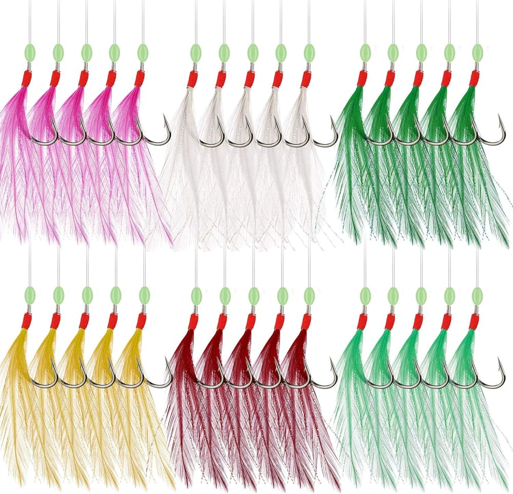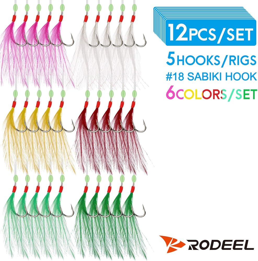 12 عبوة من 12 قطعة / 60 سنانير ماكريل ريش البحر قارب شاطئ رصيف طُعم صنارة صيد طُعم من روديل، 5 مواضع للخطاطيف / حزمة ريش، 6 ألوان