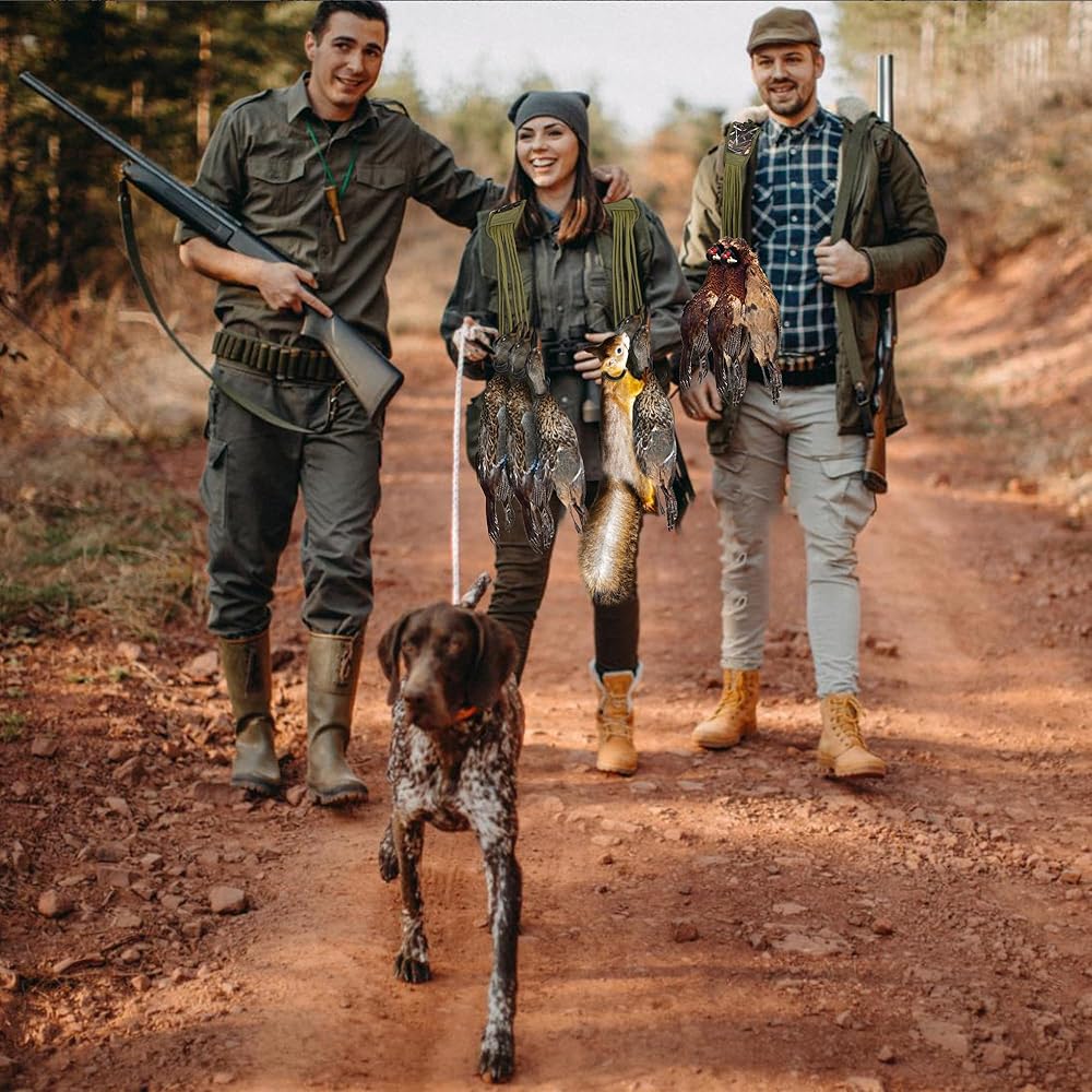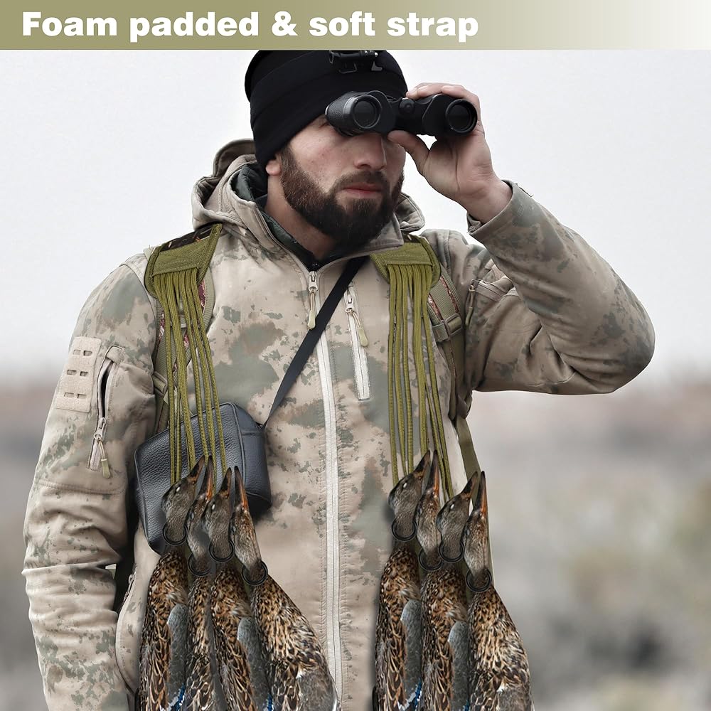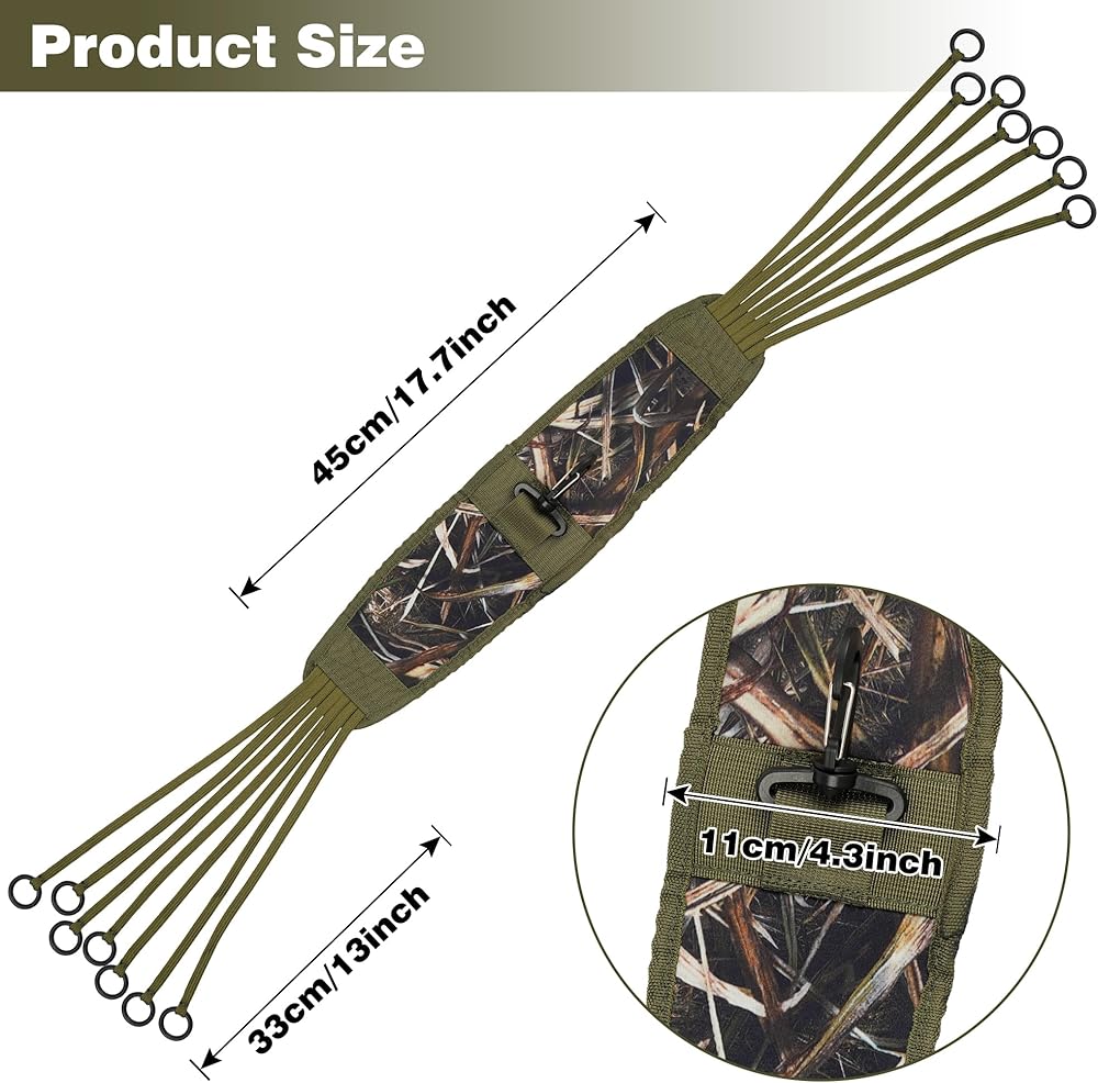• Tough Bird Hunting Game Strap: the foam paded and abrasion-resistant canvas strap designed provides extra ergonomic comfort. Synthetic Leather with Zig-Zag sewing seams makes the duck hanger more durable sturdy. The carabiner clip is good for hanging the strap from a tree branch, backpack, or back of the hunting chair, keeping the birds off the ground and keeping out of the dog's reach. Slip-resistant backing ensures secure placement while carrying.