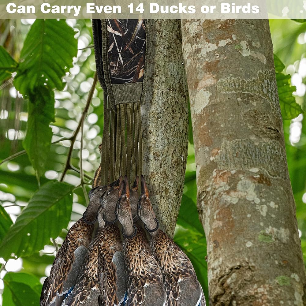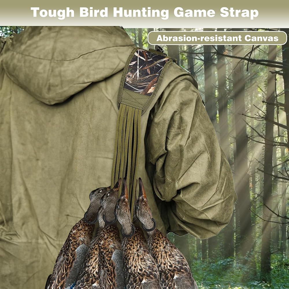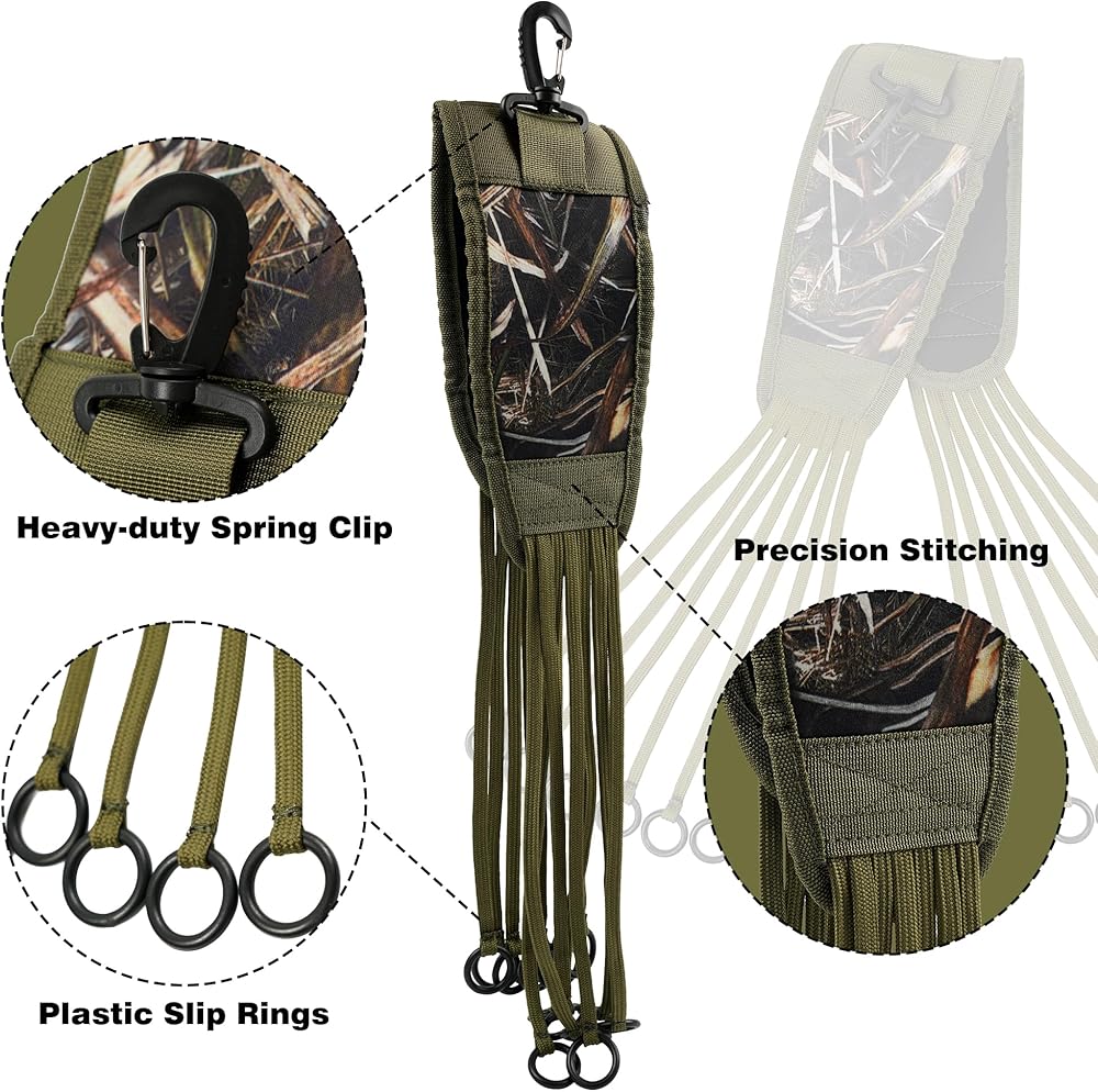 • High quality game strap: you will receive a game strap with a heavy-duty spring clip and 14 plastic slip rings, 7 per side. Can carry at least 14 ducks and will last for more hunting seasons. Just carry it over your shoulder or neck to free up your hands.