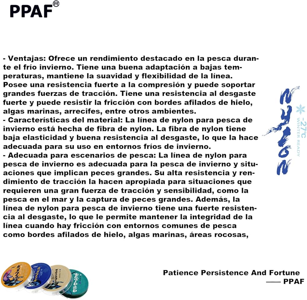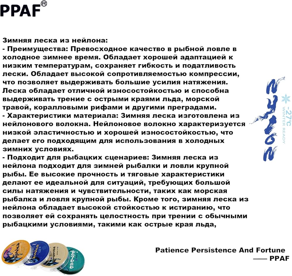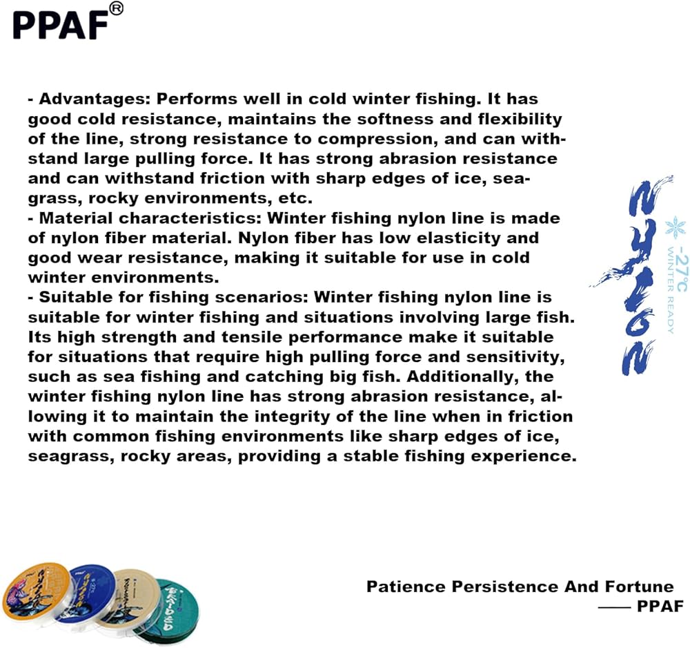 عندما تختار PPAF، فإنك تختار علامة تجارية تجعل جودتها تتحدث. يجسد خط نايلون الصيد الشتوي تفاني PPAF البسيط في تجربة الصيد الخاصة بك. ارفع مستوى لعبة الصيد الخاصة بك، وثق في PPAF، وابدأ مغامرتك القادمة بثقة هادئة.