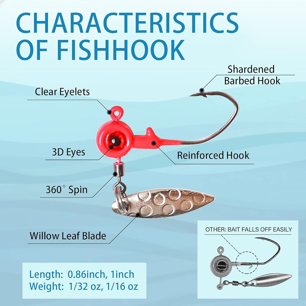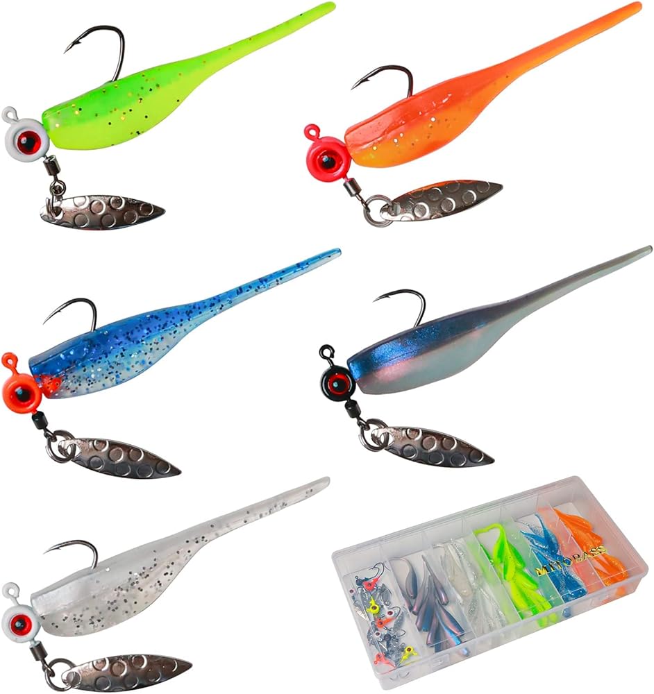Crappie Jigs: MITOBASS 3D Eye jighead مع جاذبية إضافية لشفرة أوراق الصفصاف الدوارة بزاوية 360 درجة، مما يجعلها مرئية حتى في ظروف الإضاءة الخافتة.