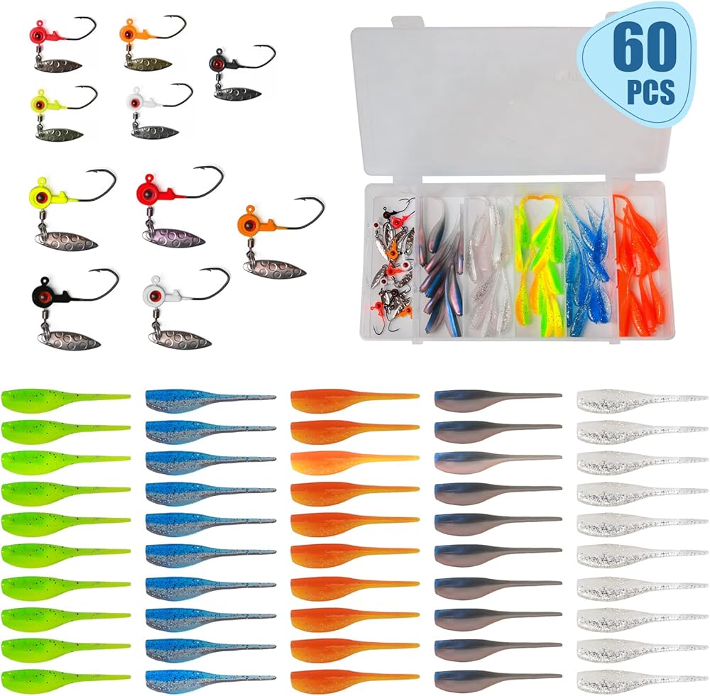 Crappie Erminator: مجموعة MITOBASS Baby Shad تتضمن 50 غطاء أطفال مقاس 2 بوصة في 5 ألوان فعالة. 10 رؤوس BigEye مع دوار بمقاسين (1/16 أونصة و1/32 أونصة)، 5 ألوان، كل ذلك في صندوق طُعم شفاف.