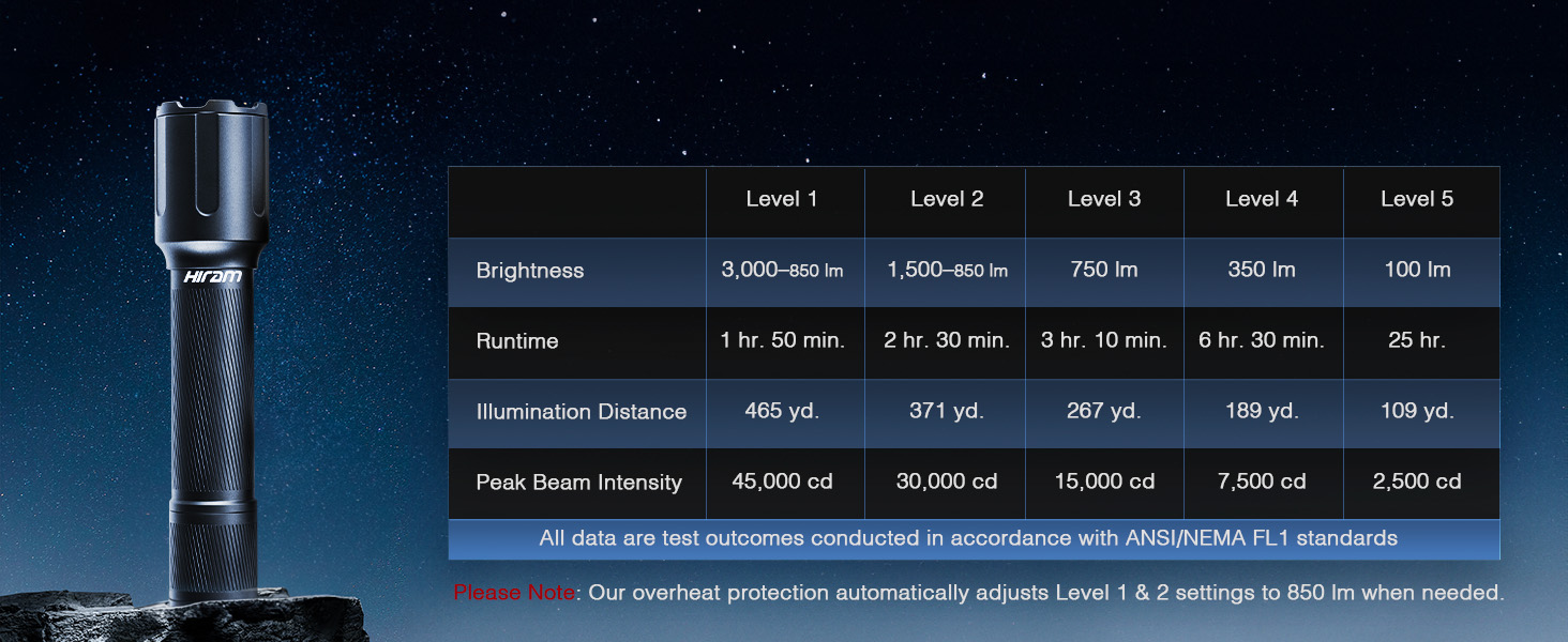 6 أوضاع قابلة للتخصيص: يمكنك التنقل بسهولة عبر خمسة مستويات سطوع ووضع ستروب بالضغط المزدوج على الزر. تقوم الحماية من الحرارة الزائدة تلقائيًا بضبط إعدادات المستوى 1 و2 على 850 لومن عند الحاجة.
