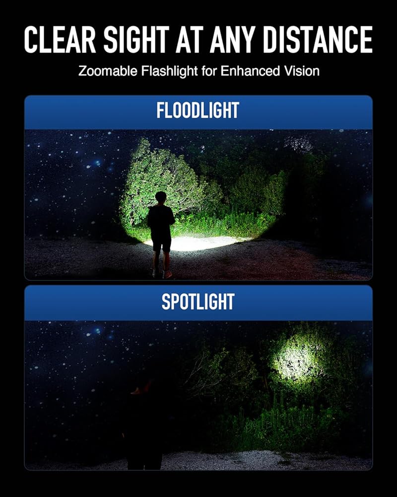 خيارات الإضاءة المزدوجة: قم بتنشيط وضع الضوء على أعلى مستوى له للحصول على مسافة مذهلة تبلغ 465 ياردة. الوصول، مما يضمن رؤية واضحة في السيناريوهات البعيدة. اختر وضع الضوء الكاشف للحصول على تغطية موسعة أثناء البحث والتخييم والمشي لمسافات طويلة.