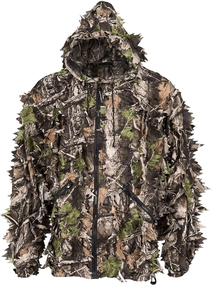 سترة صيد مموهة بغطاء للرأس: تحتوي بدلة غيلي هذه على سترة صيد مموهة واسعة الحيلة مع غطاء رأس مرفق وسحاب أمامي كامل للإغلاق؛ جيبان أماميان كبيران بسحاب لسهولة التخزين والوصول؛ أطراف أكمام وخصر مطاطية لملاءمة مثالية.