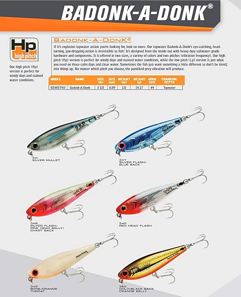 إذا كنت تبحث عن حركة متفجرة في المياه العلوية، فلا تبحث بعد الآن. إن حركة Badonk-A-Donk التي تخطف الأنظار وتلفت الأنظار وتسقط الفك في المياه العلوية لا تقاوم للأسماك! لقد تم تصميمه من الداخل إلى الخارج باستخدام أجهزة ومكونات شديدة التحمل من فئة المياه المالحة. يتم تقديمه بحجمين ومجموعة متنوعة من الألوان ودرجتين (تردد الاهتزاز). إن إصدار درجة الصوت العالية (Hp) الخاص بنا مثالي للأيام العاصفة وظروف المياه الملطخة، في حين أن إصدار درجة الصوت المنخفضة (Lp) هو ما تحتاجه في تلك الأيام الهادئة والمياه الصافية. في بعض الأحيان تريد الأسماك شيئًا مختلفًا قليلًا، لذا لا تكن خجولًا؛ خلط الأشياء. بغض النظر عن درجة الصوت التي تختارها، فإن اهتزاز الفريسة المذعورة سوف ينتج.