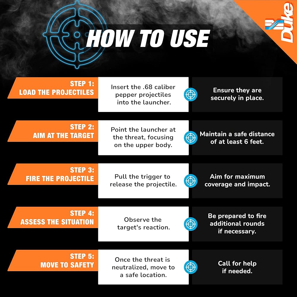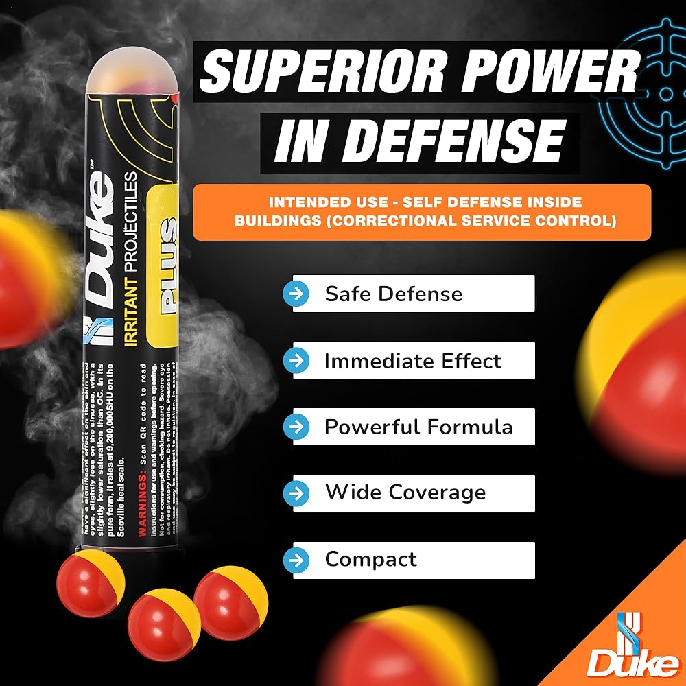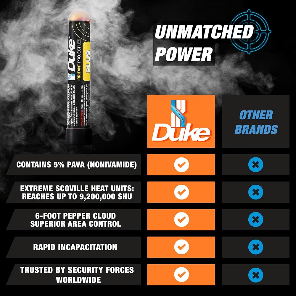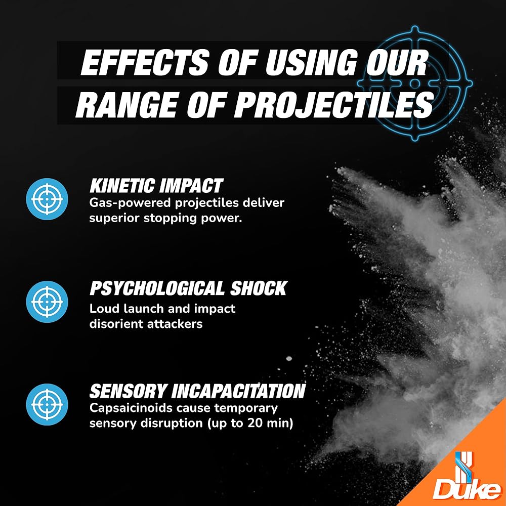 ⭐ تعتبر شركة Duke Defense أكبر منتج لمقذوفات الفلفل على مستوى العالم. تعتبر Duke Pepper Round هي الأكثر فعالية في السوق، حيث تجمع بين التأثير الحركي والصدمة النفسية ومسحوق الكابسيسين الطبيعي للتهيج والحصول على الامتثال. يشبع المسحوق ذو القوة القصوى المنطقة بسحابة من الفلفل المهيج يبلغ طولها 6 أقدام، كما يسبب ألمًا شديدًا عند الاصطدام.