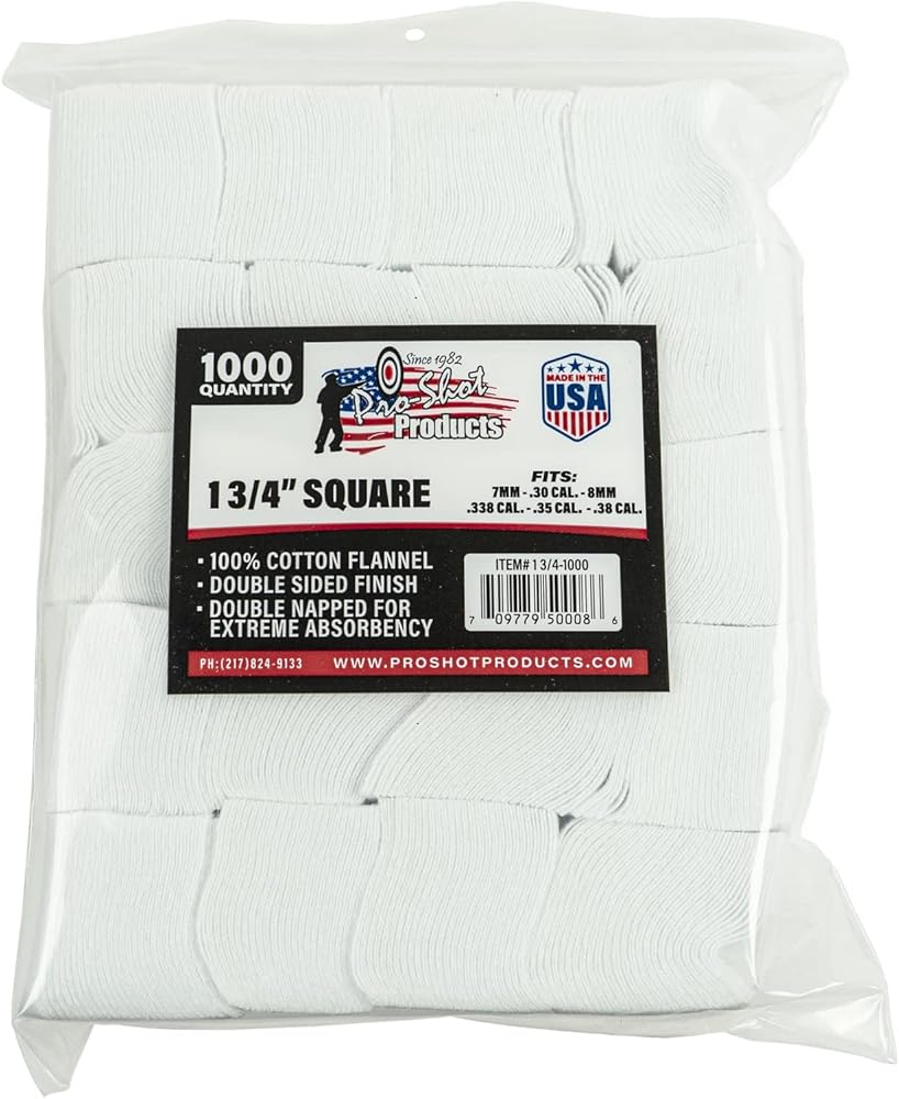 رقع Pro-Shot المصنوعة من قماش الفلانيل القطني 7 مم -.38/6 مم بينشريست 1.75 بوصة مربعة 1000 لكل حقيبة
