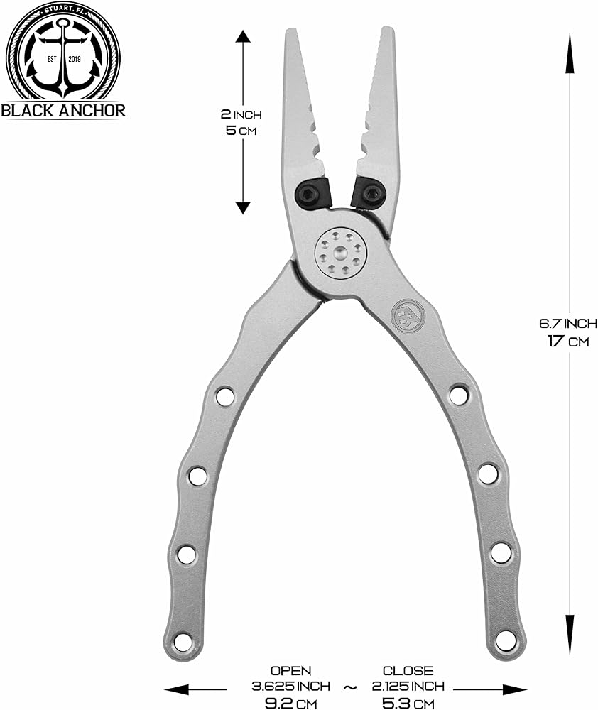 • فكوك متعددة الوظائف - قم بإمساك وإزالة أي خطاف سمك باستخدام الفك المسنن أو الاستفادة من 3 فتحات تجعيد مختلفة لتأمين وزن مقسم أو بناء قائد.