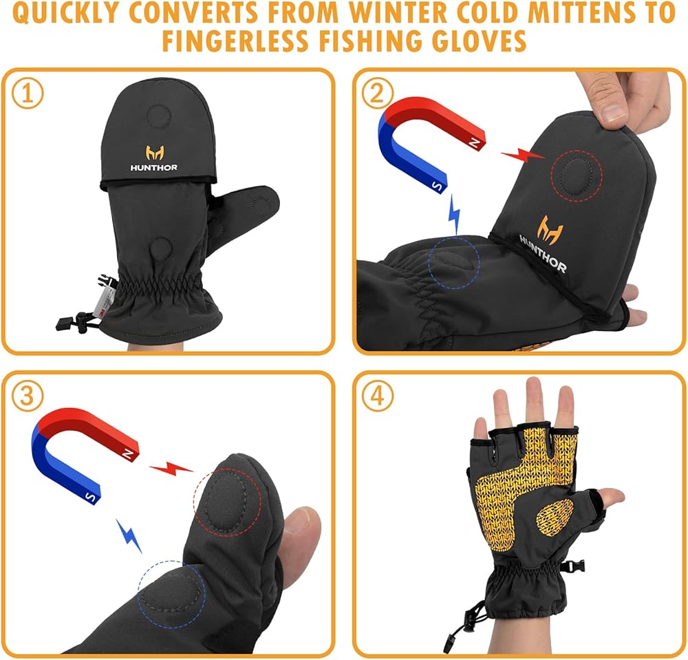 • 【تصميم قابل للتحويل】يمكنك التبديل بسهولة من قفازات الشتاء الباردة إلى قفازات الرجال بدون أصابع مع غطاء الوجه والإبهام المغناطيسي. وهذا يسمح ببراعة أكبر، وتحرير أصابعك ومنح التحكم الكامل أثناء الصيد أو التعامل مع معدات الصيد على الجليد.