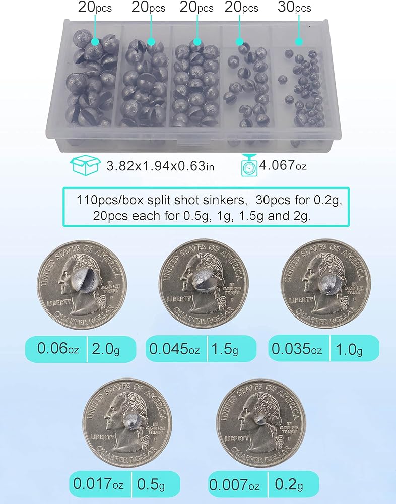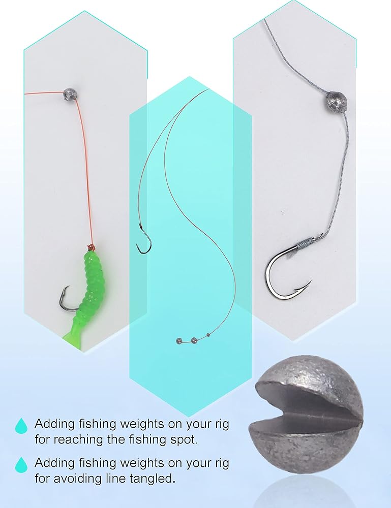 الأوزان المقسمة الخاصة بنا هي أدوات صيد قابلة للاستخدام لتعدد استخداماتها. يمكن أن تزيد أوزان الصيد من وزن أدوات الصيد، وهو مناسب للصب لفترة أطول وتثبيت جهاز الصيد الخاص بك في ظروف الرياح. يمكن استخدام الغطس المنفصل لرمي طعم الصيد الخاص بك إلى مكان الصيد المثالي والسماح للطعم بالوقوف ضد المياه سريعة الحركة. يمكنها تجنب تشابك خيوط الصيد.