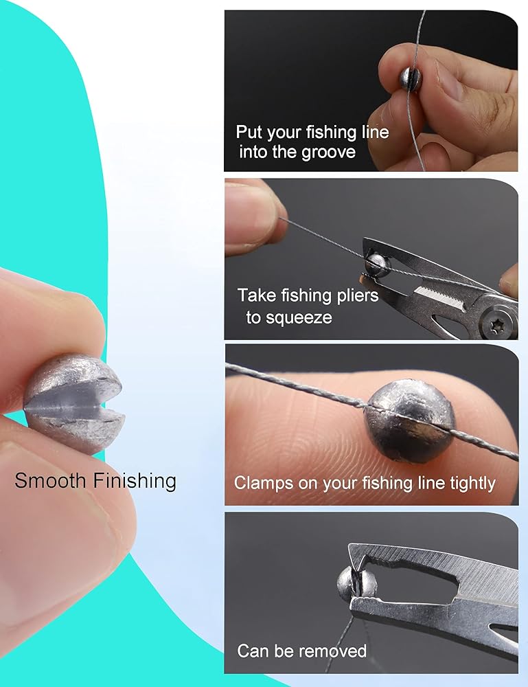 ضع خيط الصيد الخاص بك في أخدود وزن الطلقة المقسمة؛ ثم خذ كماشة الصيد أو استخدم الأصابع للضغط حتى يمسك الخيط بإحكام؛ يتم تثبيته على خيط الصيد الخاص بك دون الحاجة إلى أي عقد ويمكن إزالته بسهولة بواسطة الكماشة.