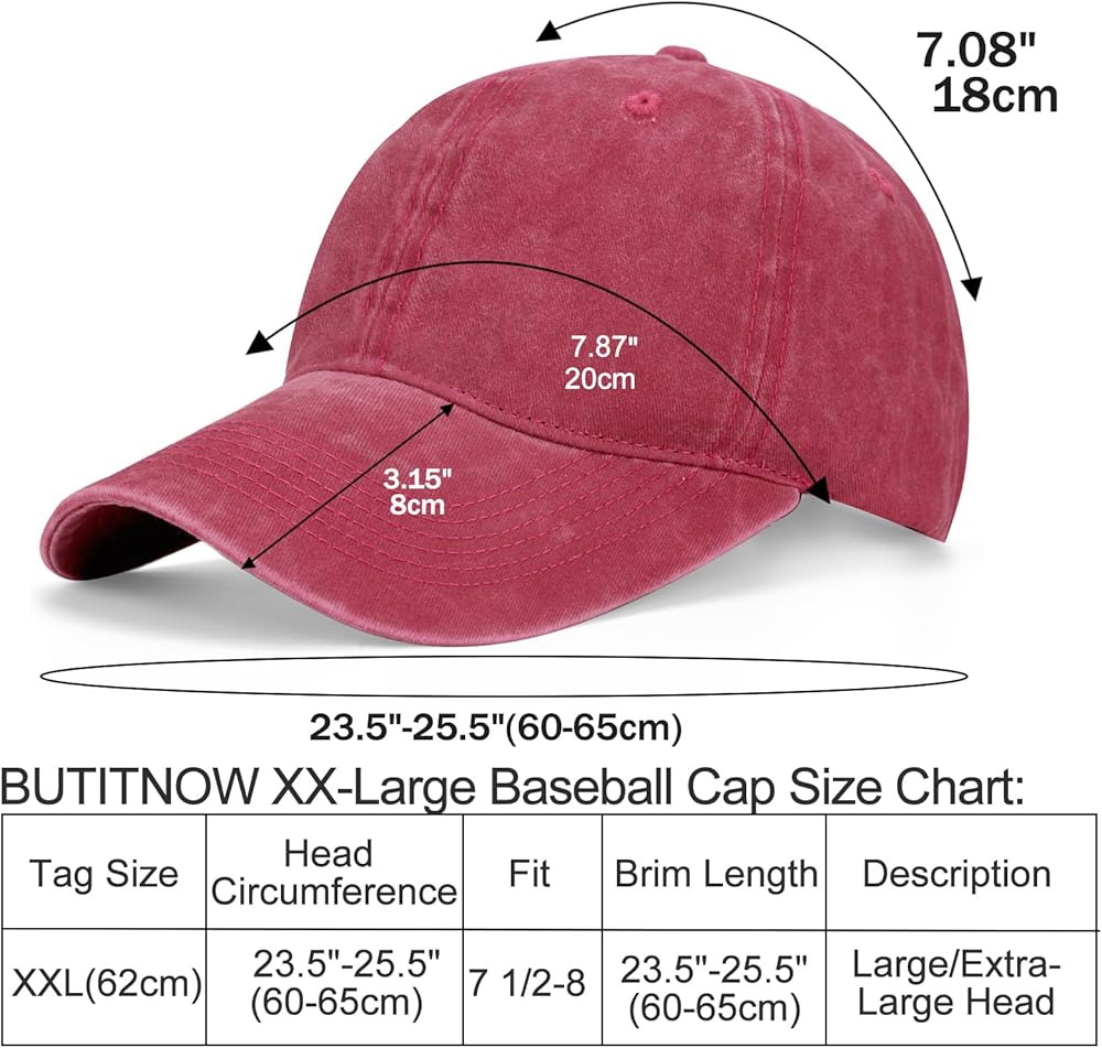 【قبعات رأس كبيرة】- مقاس كبير جدًا يناسب الرؤوس الكبيرة 23.5 بوصة - 25.5 بوصة، طول الحافة/المنقار: 3.15 بوصة (8 سم). عمق القبعة: 7.08 بوصة (18 سم). إبزيم معدني قابل للتعديل على الظهر للأشخاص ذوي الرؤوس الكبيرة أو الشعر الكثيف.
