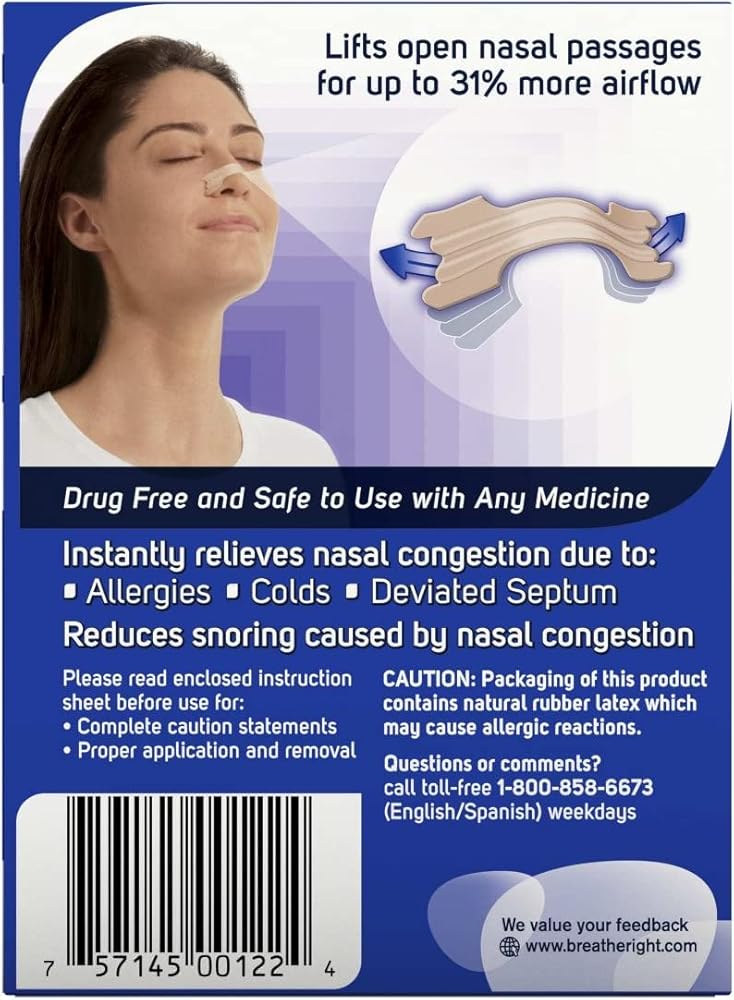 وصف المنتج: شرائط أنفية للتسمير الأصلي من بريذ رايت تساعد على التنفس لروتينك الليلي. ترفع وتفتح الممرات الأنفية لمساعدتك على التنفس بشكل أفضل حتى تتمكن من النوم بشكل أفضل. استخدميها لتقليل احتقان الأنف بسبب البرد أو الحساسية أو الحاجز المنفصل والمساعدة في تقليل أو حتى إيقاف الشخير بسبب احتقان الأنف بالكامل. شرائط الأنف الناعمة هي الأشرطة الأنفية الوحيدة التي تستخدم تقنية 3M من أجل ملاءمة وإزالة مريحة. مصنوعة من أربطة مرنة تشبه الزنبرك، تفتح أنفك أكثر بنسبة تصل إلى 38 بالمائة مقارنة برشاشات مزيل للاحتقان وحدها. بغض النظر عن نوع احتقان الأنف، فهناك منتج التنفس رايت المناسب لك. تأتي شرائط الأنف بريذ رايت في مجموعة متنوعة من القوى والمقاسات والأنواع، بما في ذلك الأشرطة الأصلية (في الأحجام الصغيرة/المتوسطة أو الكبيرة)، وقوة إضافية، وسمرة وشفافة ومعطرة باللافندر. بالإضافة إلى ذلك، فإن كل شريط خالٍ من العقاقير وآمن للاستخدام مع الأدوية الأخرى. جربيها اليوم لإيقاف الشخير وتخفيف احتقان الأنف على الفور حتى تتمكن من التنفس بشكل أفضل والنوم بشكل أفضل والشعور بشعور أفضل. شرائط الأنف للتسمير أوريجينال من بريذ رايت تساعدك على التنفس بشكل أفضل حتى تتمكن من النوم بشكل أفضل. شرائط الأنف اليمنى هي أداة مساعدة خالية من العقاقير توفر الراحة الفورية للاحتقان الليلي بسبب البرد أو الحساسية مصنوعة من شرائط مرنة تناسب أعلى الأنف مباشرة، ورفع الممرات المصابة بالجيوب الأنفية الملتهبة لسهولة التنفس، يفتح أنفك أكثر بنسبة تصل إلى 38% مقارنة بالرشات المسببة للاحتقان وحدها. متوفر بالمقاسات صغير/متوسط وكبير. تعليمات جرّب واحدة إذا كنت تعاني من: الشخير. للحصول على أفضل النتائج، استخدمي انسداد الأنف ليلاً بسبب الحساسية أو البرد أو الحاجز المنفرق. تحذيرات: تحذير السلامة: عبوة هذا المنتج تحتوي على مطاط طبيعي قد يسبب الحساسية. لا تستخدميه على البشرة المصابة بالتقرحات أو المصابة بحروق الشمس أو المتهيجة.