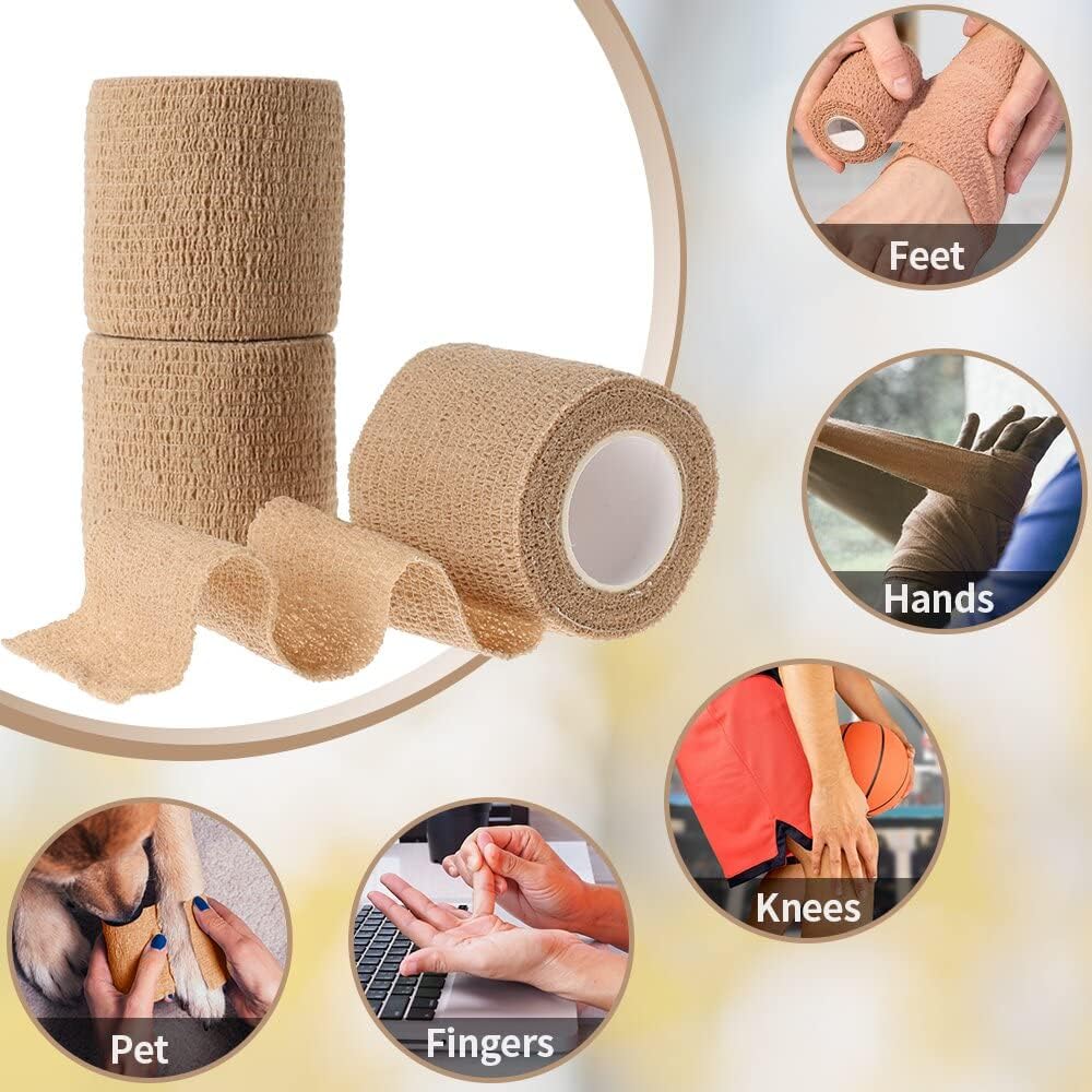 متعددة الأغراض: يمكن استخدام أغلفة الضمادات ذاتية اللصق على المعصمين والركبتين وأجزاء مختلفة من الجسم للحماية أثناء التمرين، ولتقديم المساعدة لسلالات العضلات والمفاصل المتورمة، ولرعاية الحيوانات الأليفة والحيوانات.