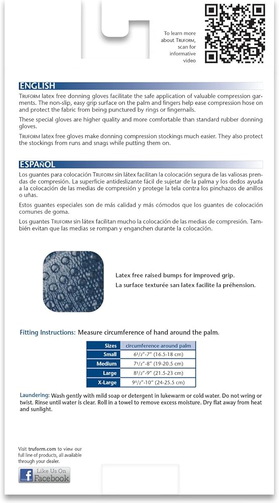 Truform 0757 هو زوج من القفازات الخالية من اللاتكس. إنها تسهل الاستخدام الآمن للملابس الضاغطة القيمة ويجب أن يمتلكها كل مستخدم للجوارب. يساعد السطح غير القابل للانزلاق وسهل الإمساك على راحة اليد والأصابع على تخفيف الضغط على الجوارب وحماية القماش من التلف بسبب الحلقات أو الأظافر. تتضمن العبوة زوجًا واحدًا.