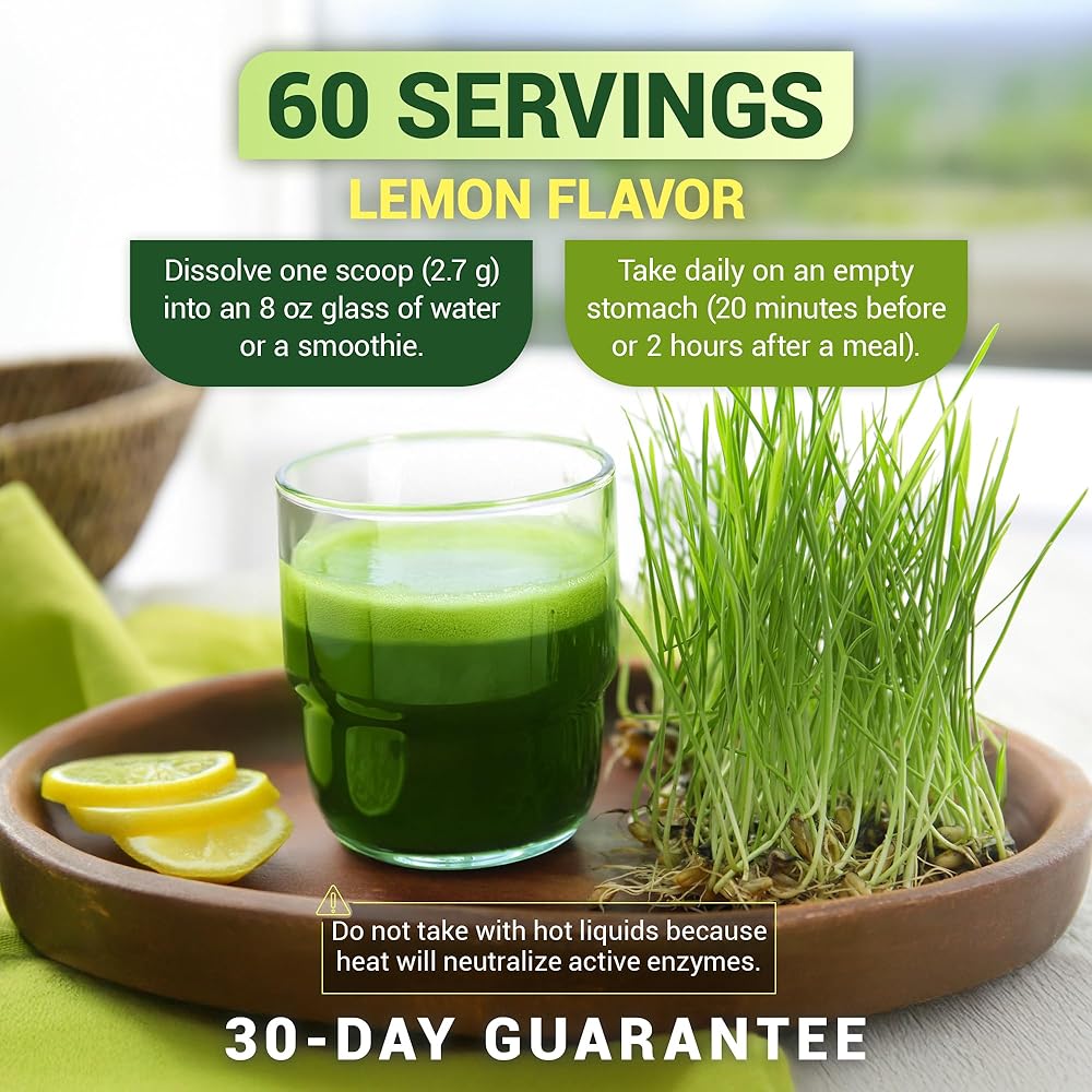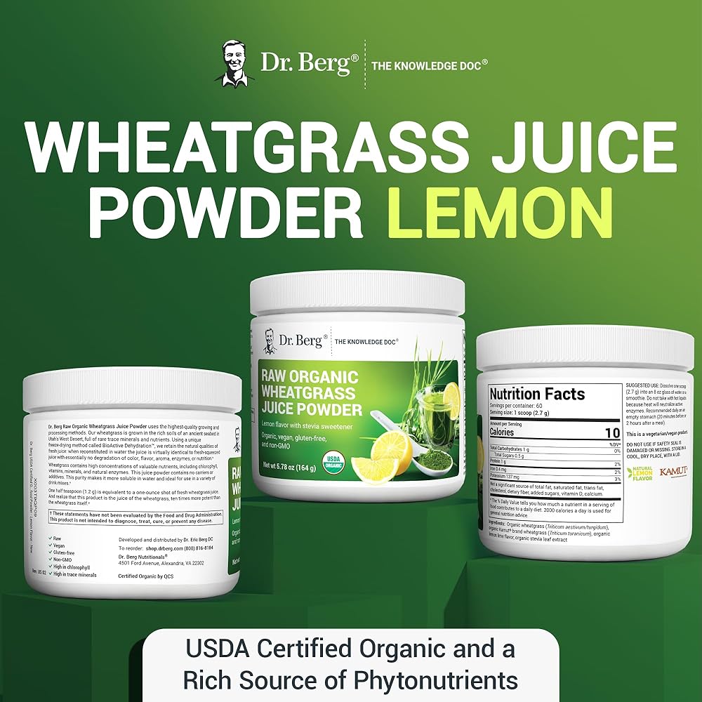 مسحوق عصير عشبة القمح الخام من دكتور بيرج (60 حصة) - مسحوق عشبة القمح العضوي المعتمد من وزارة الزراعة الأمريكية مع الكلوروفيل والمعادن النزرة والإنزيمات الطبيعية - فائق التركيز - نكهة الليمون مع ستيفيا 3 عبوات
