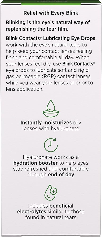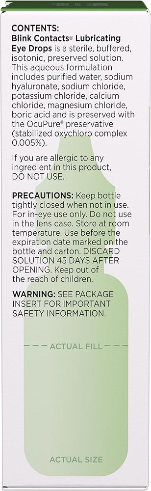 قطرات تشحيم العين من Amo Blink Contacts، عدد 2. المكونات: قطرات العين التشحيمية من Blink Contacts عبارة عن محلول معقم ومخزن ومتساوي التوتر ومحفوظ. تشتمل هذه التركيبة المائية على الماء النقي وهيالورونات الصوديوم وكلوريد الصوديوم وكلوريد البوتاسيوم وكلوريد الكالسيوم وكلوريد المغنيسيوم وحمض البوريك ويتم الحفاظ عليها باستخدام مادة حافظة OcuPure.