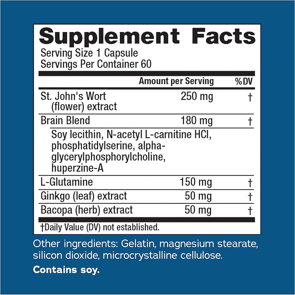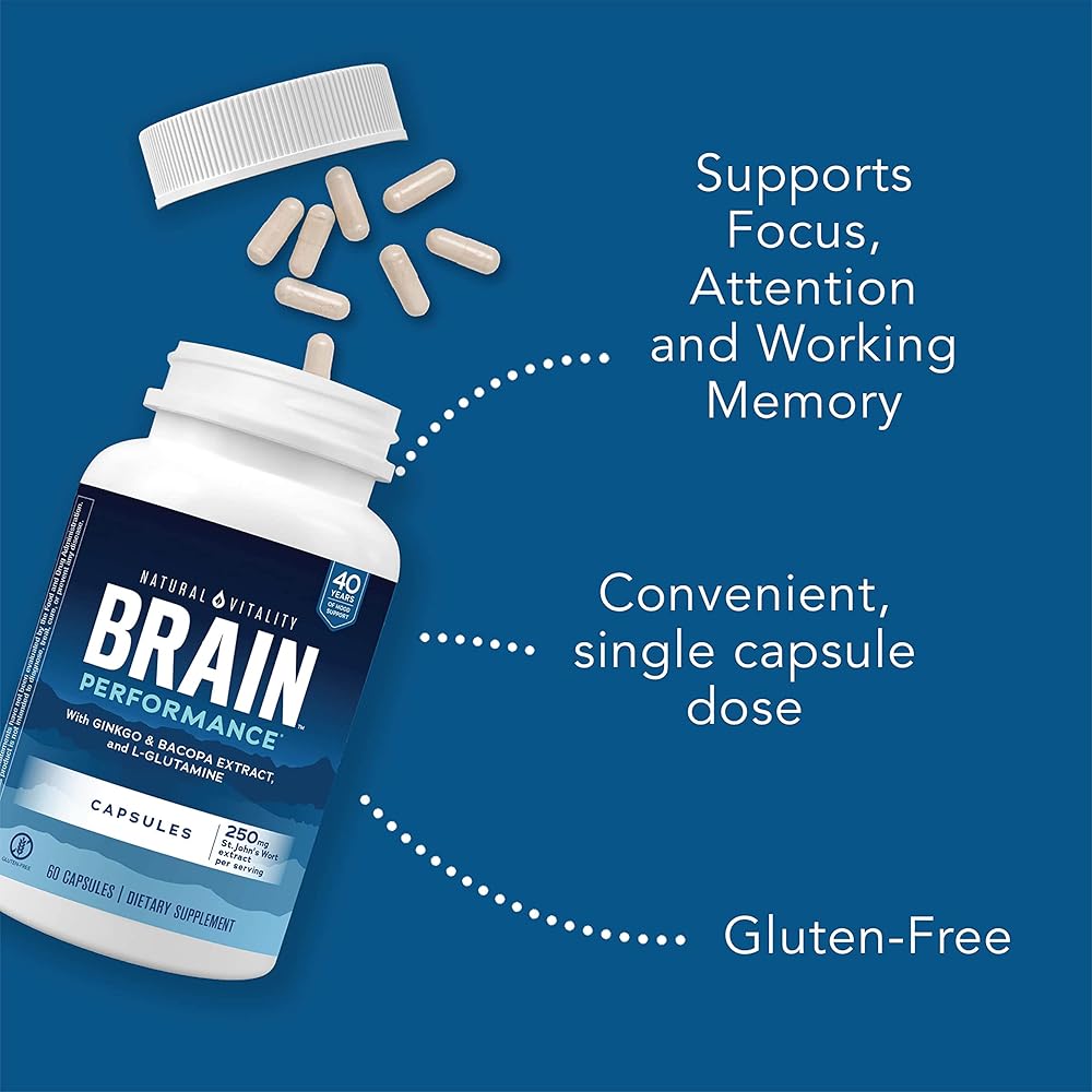أداء الدماغ الطبيعي والحيوي، مع مستخلص الجنكة والباكوبا، وإل-جلوتامين، ونبتة سانت جونز؛ يساعد على دعم الإدراك والانتباه والذاكرة العاملة؛ خالي من الغلوتين؛ 60 كبسولة مرة واحدة يوميًا*