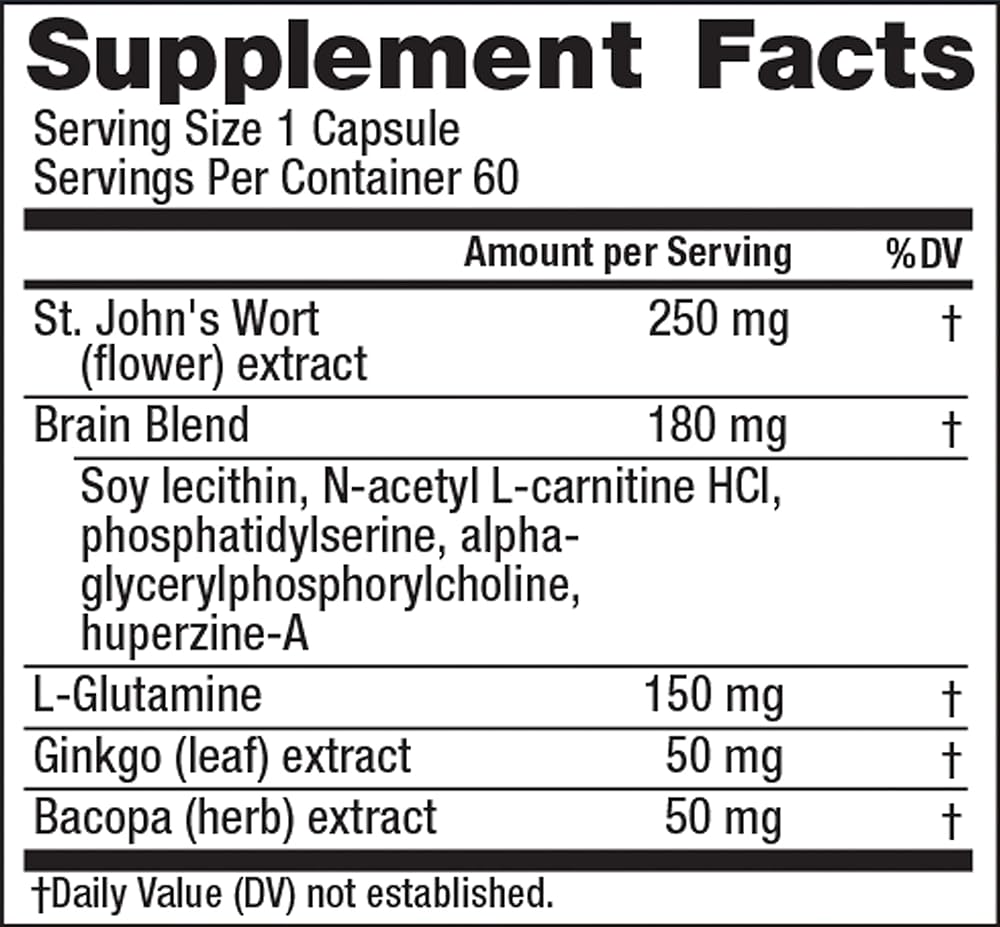 250 مجم ش. مستخلص نبتة سانت جون لكل جرعة: يتكون من مستخلص الجنكة والباكوبا وإل-جلوتامين ونبتة سانت جون للحصول على هذا الدعم الإضافي للمساعدة في التغلب على اليوم*