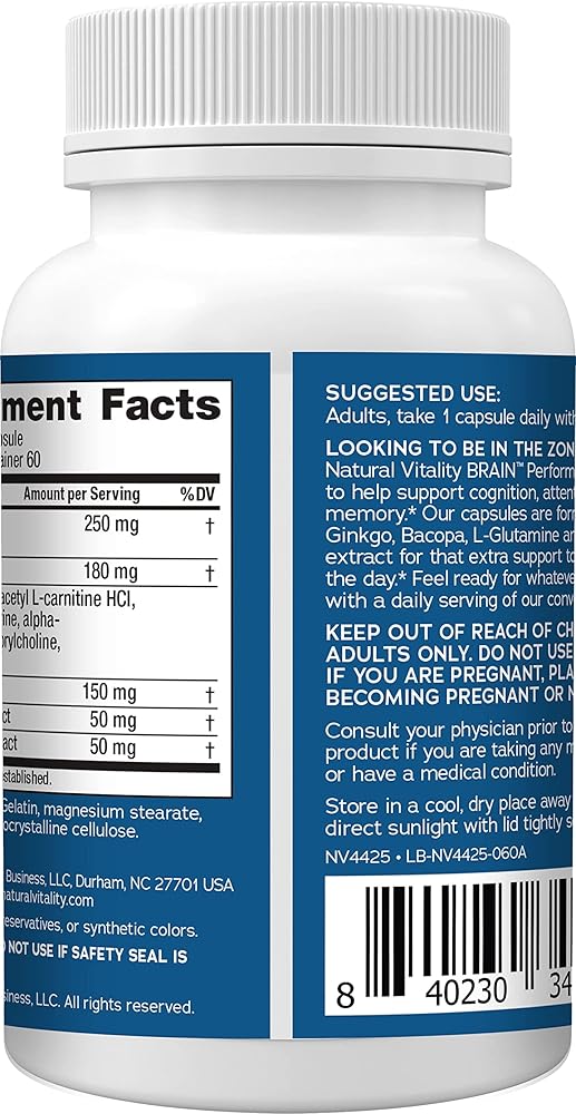 تساعد كبسولات Natural Vitality BRAIN Performance على دعم الإدراك والانتباه والذاكرة العاملة.* تم تركيبها باستخدام الجنكة والباكوبا وL-Glutamine ومستخلص نبتة سانت جون للحصول على هذا الدعم الإضافي لمساعدتك على التغلب على اليوم.* أعد تشغيل محركك العقلي مع هذا بديل القهوة الذي يمنحك التركيز الطبيعي والوضوح دون أي توتر، وهو بمثابة دفعة خالية من الكافيين لعقلك السليم. * اشعر بالاستعداد لأي شيء يأتي في طريقك مع كبسولة واحدة مناسبة يوميًا. خالي من الغلوتين؛ بدون نكهات صناعية أو مواد حافظة أو ألوان صناعية. لم يتم تقييم هذه البيانات من قبل إدارة الغذاء والدواء. ليس المقصود من هذا المنتج تشخيص أي مرض أو علاجه أو علاجه أو الوقاية منه.
