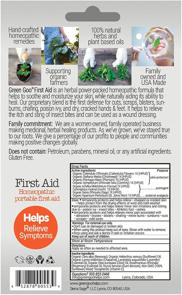 يعزز هذا المرهم النباتي المعبأ بالطاقة والمحمول قدرات جسمك على الشفاء ويحل محل أكثر من 20 قطعة إسعافات أولية تقليدية، مما يجعله مثاليًا لكل مغامرة ومجموعة الإسعافات الأولية. إنه دفاعك الأول عن الجروح والخدوش والبثور وحروق الشمس والاحتكاك واللبلاب السام وتشقق اليدين والقدمين. كما أنه يساعد على تخفيف حكة لدغات الحشرات ويمكن استخدامه كضمادة للجروح.