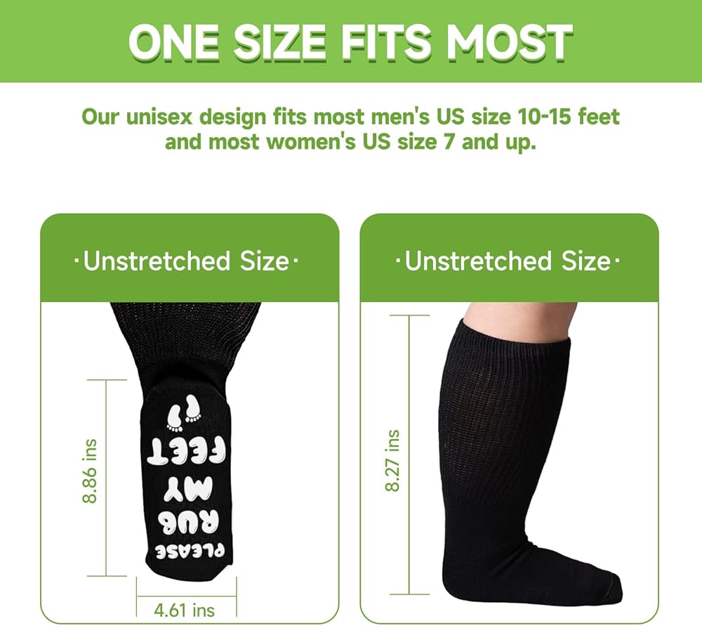 One Size Fits Most: The diabetes socks fits most men US size 10-15 feet and most women US size 7 and up. Extra wide at calf makes you easy to wear even having a cast on your foot, ankle or leg. These hospital socks with grips are made of a soft blend of 91% cotton, 7% Nylon and 2% spandex, which allow them to comfortably stretch.