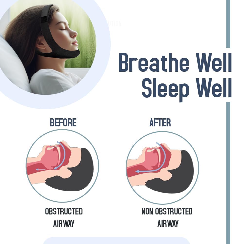 ملاءمة مريحة معززة: يتميز حزام الذقن المضاد للشخير بقماش لطيف ومسامي يتكيف مع منحنياتك، مما يضمن ملاءمة مريحة دون إزعاج