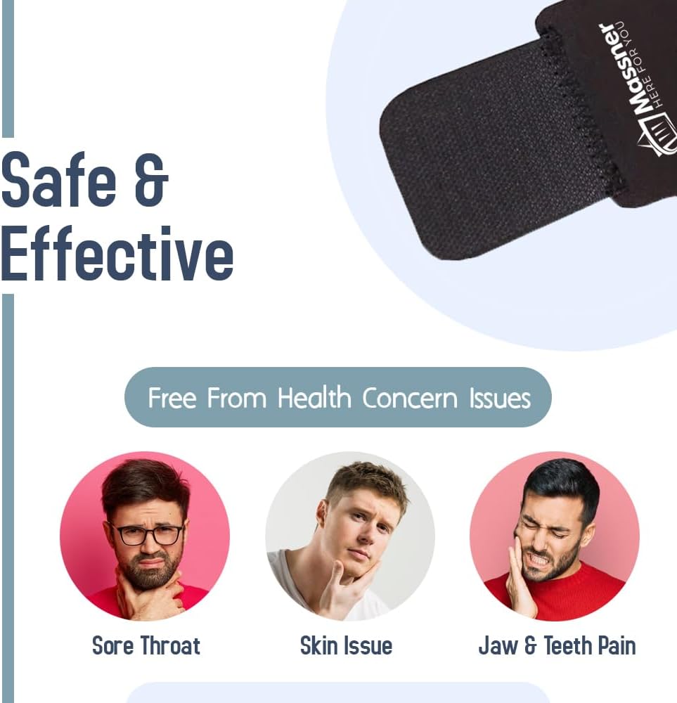 مُعاد تصميمه من أجل الجودة: يتميز بمواد متينة وصديقة للبشرة وشريط فيلكرو محسّن لا يبلى، وقد تم تصميم هذا الحزام لرفعه وليس سحبه للخلف لتقليل الشخير بشكل فعال.