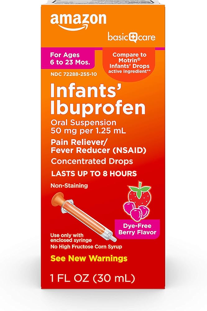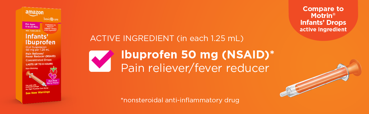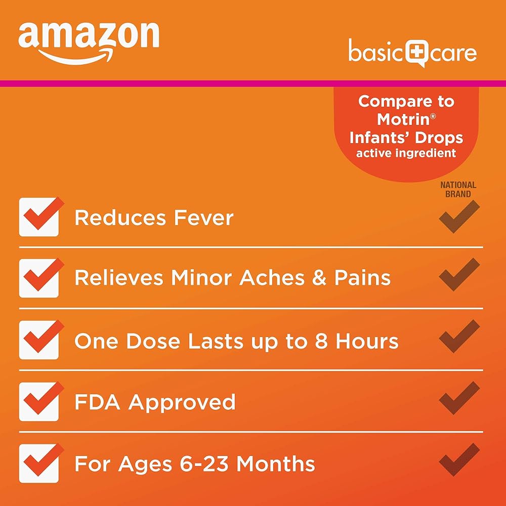 قارنه بالعنصر النشط Motrin Infants' Drops. العنصر النشط في Amazon Basic Care Infants' Concentrated Drops Ibuprofen Oral Suspension، 50 مجم لكل 1.25 مل، نكهة التوت، هو 50 مجم إيبوبروفين لكل 1.25 مل، مسكن للألم ومخفض للحمى للرضع الذين تتراوح أعمارهم بين 6 أشهر إلى 23 شهرًا. يعمل هذا المنتج على تقليل الحمى مؤقتًا وتخفيف الآلام والأوجاع الطفيفة الناتجة عن نزلات البرد والأنفلونزا والتهاب الحلق والصداع وآلام الأسنان. إيبوبروفين الأطفال الخالي من الصبغة وغير الملوث هو أيضًا خالي من شراب الذرة عالي الفركتوز والغلوتين. استخدم فقط مع الحقنة المغلقة.
