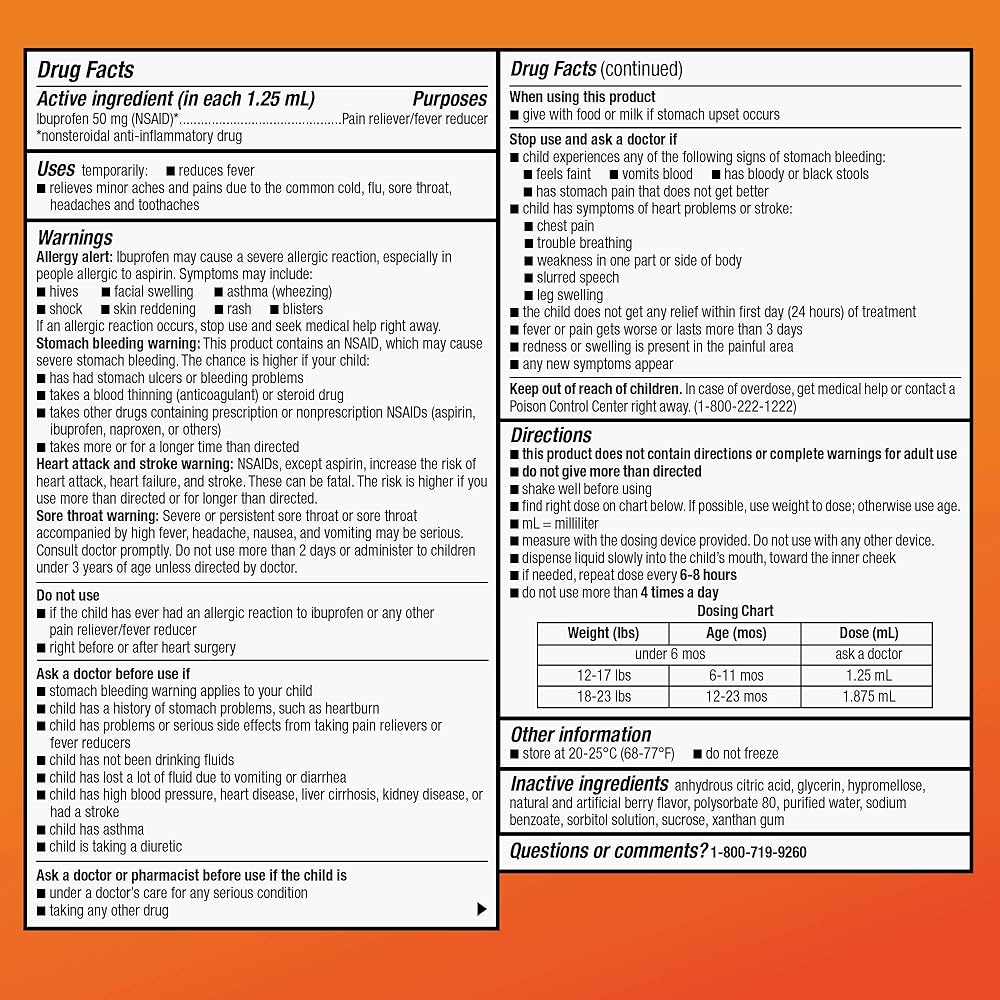 العنصر النشط: يحتوي هذا المنتج على 50 ملغ من ايبوبروفين لكل 1.25 مل، وهو مسكن للألم ومخفض للحمى وعقار مضاد للالتهابات غير الستيرويدية (NSAID). قارنه بالعنصر النشط الموجود في قطرات Motrin للرضع