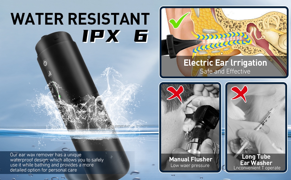 ✅[مقاومة للماء بدرجة IPX6 للاستخدام أثناء الاستحمام]: مجموعة أدوات غسل الأذن قابلة لإعادة الشحن وآمنة للاستحمام، مصنفة IPX6 مقاومة للماء للاستخدام الجيد في الحمام أو الحمام. ويمكنك أيضًا غمر جهاز تنظيف الأذن في الماء لعمق يصل إلى متر واحد لمدة 30 دقيقة دون إتلاف الجهاز.